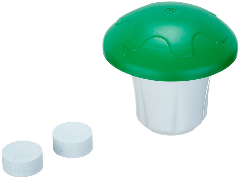 Плавающий дозатор просто бросается в воду и работает непрерывно до тех пор, пока находящийся в нём препарат не растворится до конца. Одна таблетка для воды (20 г) рассчитана к применению от 1 до 5 кубических метров воды в течение 2-3 недель. Такое приспособление является оптимальным решением для людей, имеющих небольшие бассейны без наличия скиммера. В комплекте идет сразу несколько таблеток.