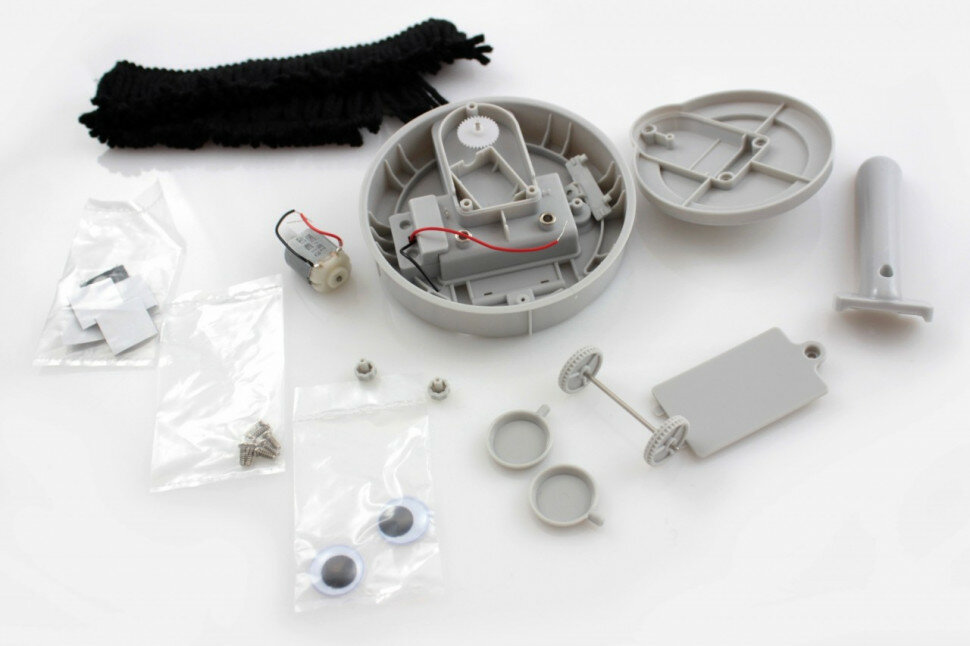 | Состав набора | крышка корпуса, корпус,ручка,крышка отсека для батареек,ось с колесами,крышка оси,мотор с проводами,наклейки-глаза (2шт.),держатели глаз (2шт.),крышки клемм (2шт.),винты, крепежи (5шт.),щетка. |