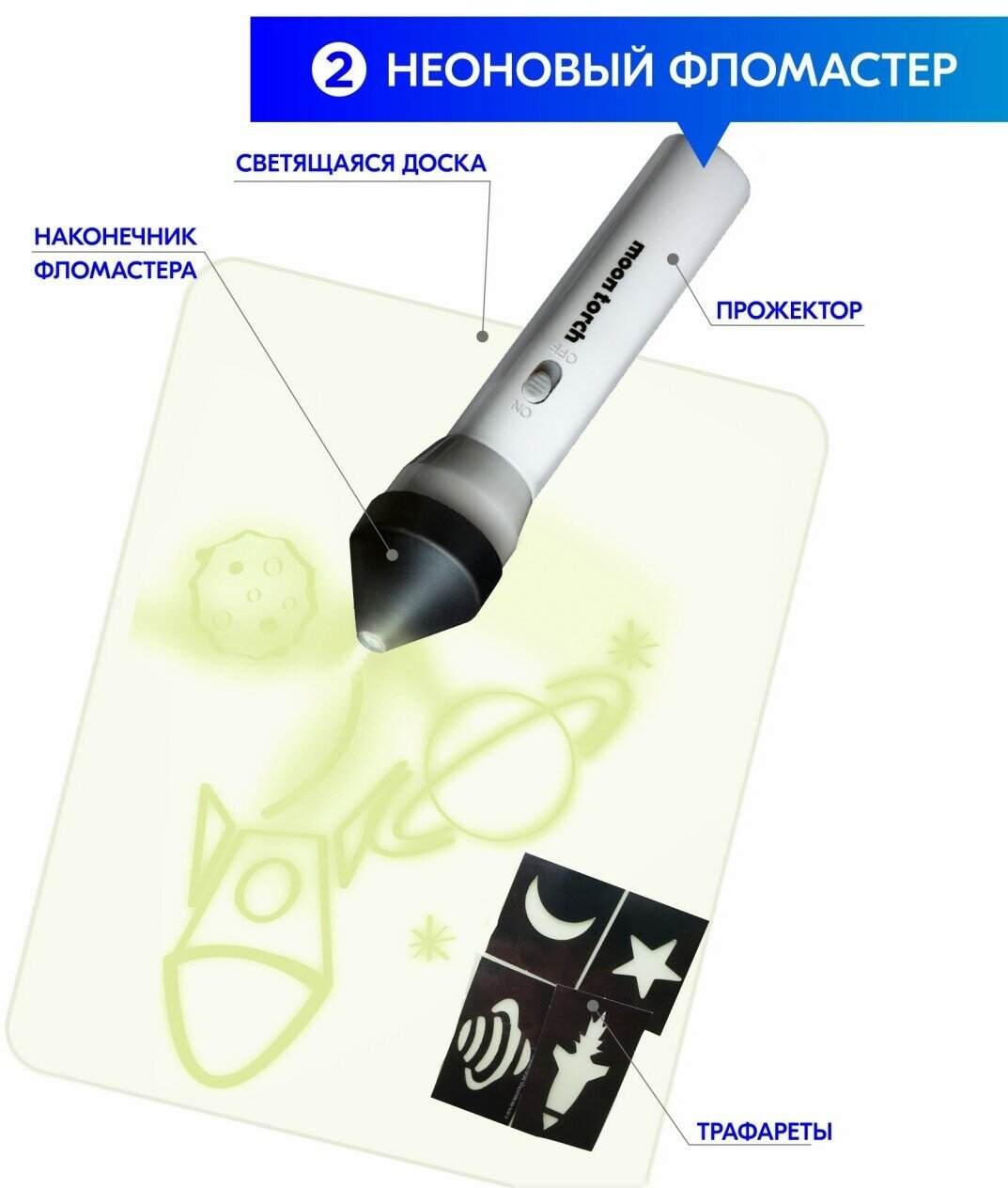 Для детей от 8 лет. Подойдет в качестве подарка. Набор 4M - находка для тех, кто мечтает увлечь ребенка наукой и техникой. Умные игрушки бренда умеют сметать пыль, искать монеты, рисовать и даже снимать кино. Этот удивительный прожектор откроет для вас лунный мир с таинственными морями и кратерами! Переделайте его в анимационный зоотроп, световой меч или неоновый фломастер! Эксперименты в наборе 1. Лунный прожектор. Теперь вы сможете смотреть на луну в любое время.