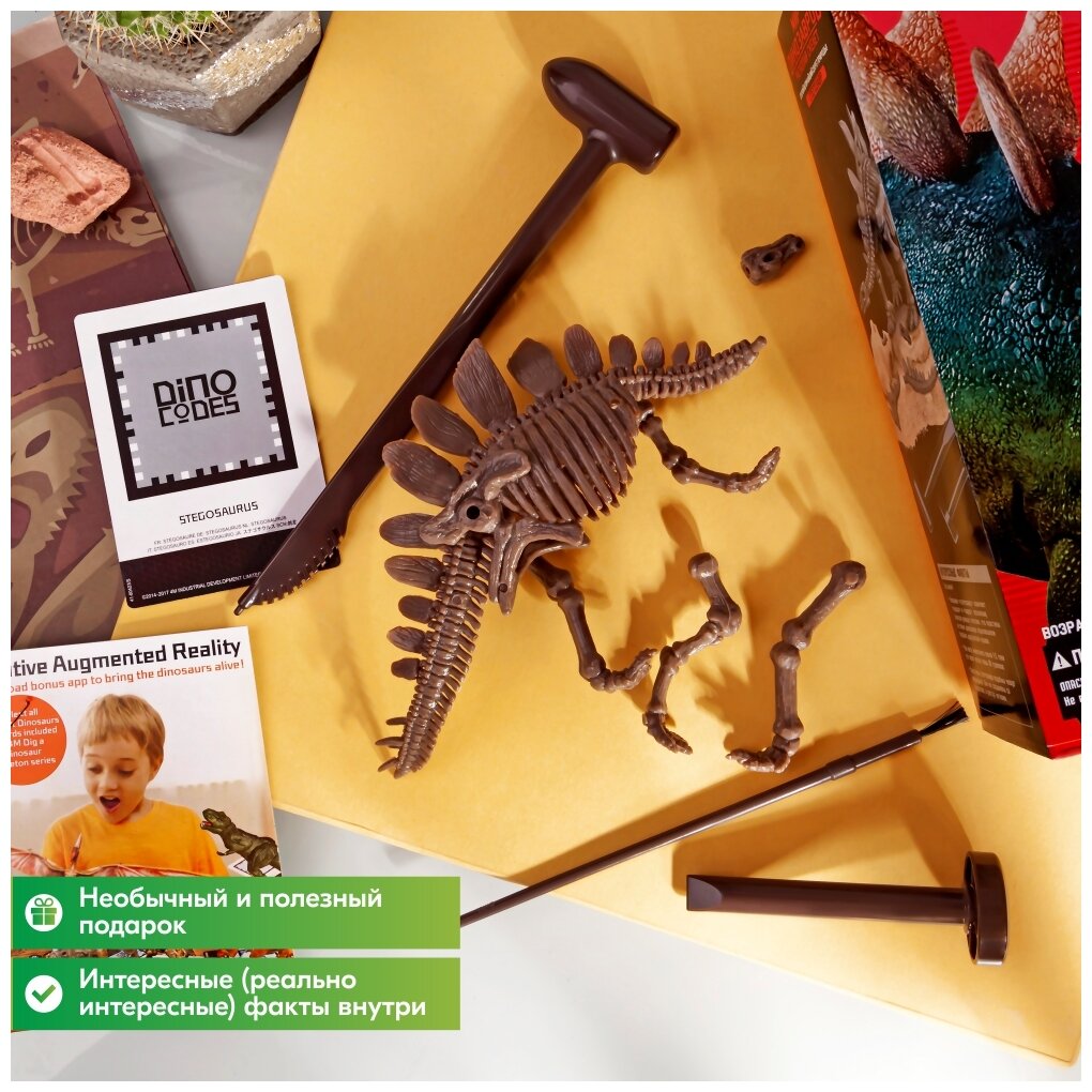 Набор Скелет Стегозавра, 4М даст возможность ребенку почувствовать себя палеонтологом. Сначала юный палеонтолог производит раскопки – молоточком, скребком и кисточкой он аккуратно расчищает гипсовый брикет, освобождая все косточки. А затем по инструкции он должен будет соединить все кости в единый скелет Стегозавра. Мягкий воск в наборе предназначен для придания более жесткого крепления костям. Ваш ребёнок сможет гордиться археологической находкой и своим первым опытом в раскопках!