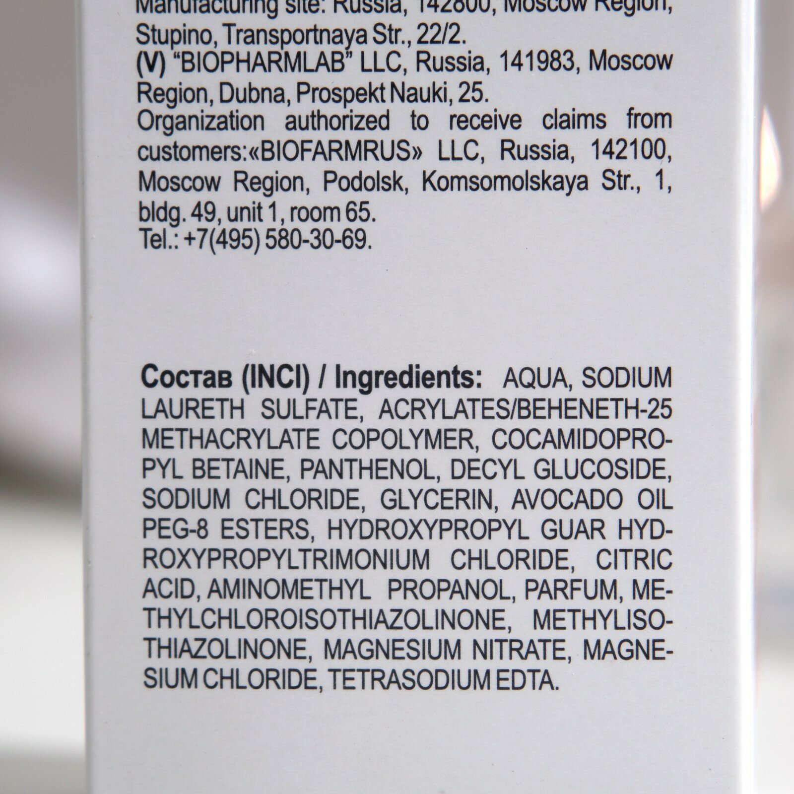 | Состав | Aqua, Sodium Laureth Sulfate, Acrylates/Beheneth-25 Methacrylate Copolymer, Cocamidopropyl Betaine, Panthenol, Decyl Glucoside, Sodium Chloride, Glycerin, Avocado Oil PEG-8 Esters, Hydroxypropyl Guar Hydroxypropyltrimonium Chloride, Сitric Аcid, Aminomethyl Propanol, Parfum, Methylchloroisothiazolinone, Methylisothiazolinone, Magnesium Nitrate, Magnesium Chloride, Tetrasodium EDTA |