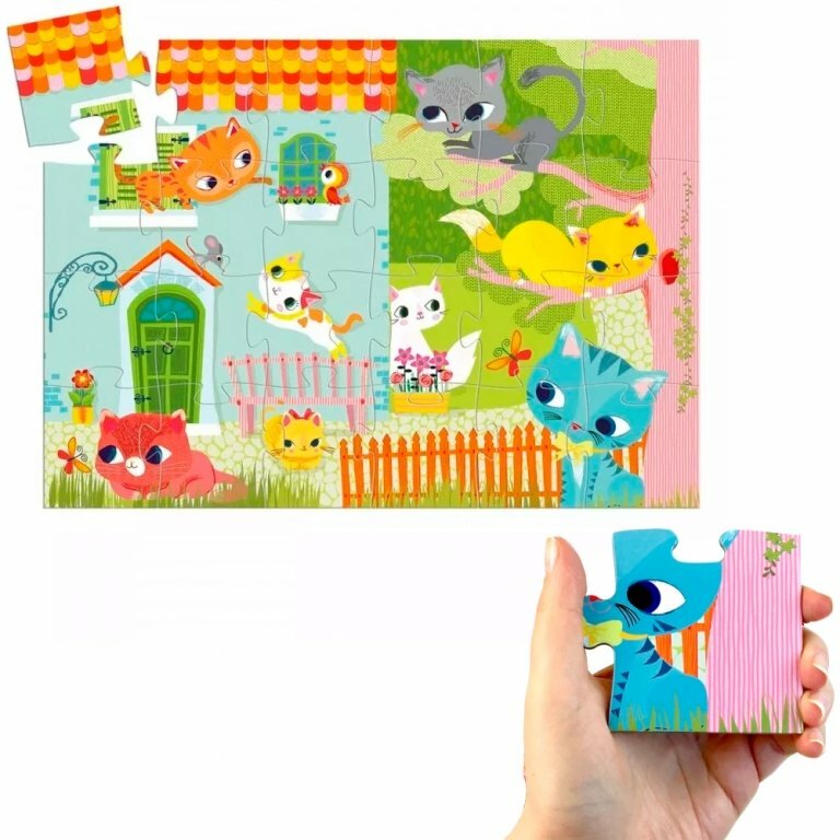 Пазл Котенок и друзья от французского бренда Djeco станет прекрасным подарком и замечательной развивающей игрой для детей от 3-х лет. Ребенку очень понравится проводить время за складыванием маленьких деталек в одну большую картину. На картинке пазла изображен двор у домика, на котором играют маленькие котята. Кто-то из них пытается поймать птичку, кто-то мышку, другой котенок спрятался под скамейку, а еще два сидят на дереве. Насыщенная деталями картинка надолго увлечет ребенка, и ему будет очень интересно поскорее собрать всю головоломку, чтобы полностью увидеть картинку. Пазл развивает мелкую моторику ручек ребенка в раннем возрасте. В процессе игры формируется усидчивость, целеустремленность, терпение, внимание и наблюдательность. Когда пазл будет сложен правильно, малыш может рассказать, что он видит на картинке. С помощью красочного пазла и веселых персонажей детям будет легко составить рассказ. Пазл упакован в оригинальную фигурную коробку в форме милого котенка с птичкой. В наборе 24 элемента. Размер собранного пазла: 42 х 30 см. Размер одного элемента пазла: 7 х 7 см.