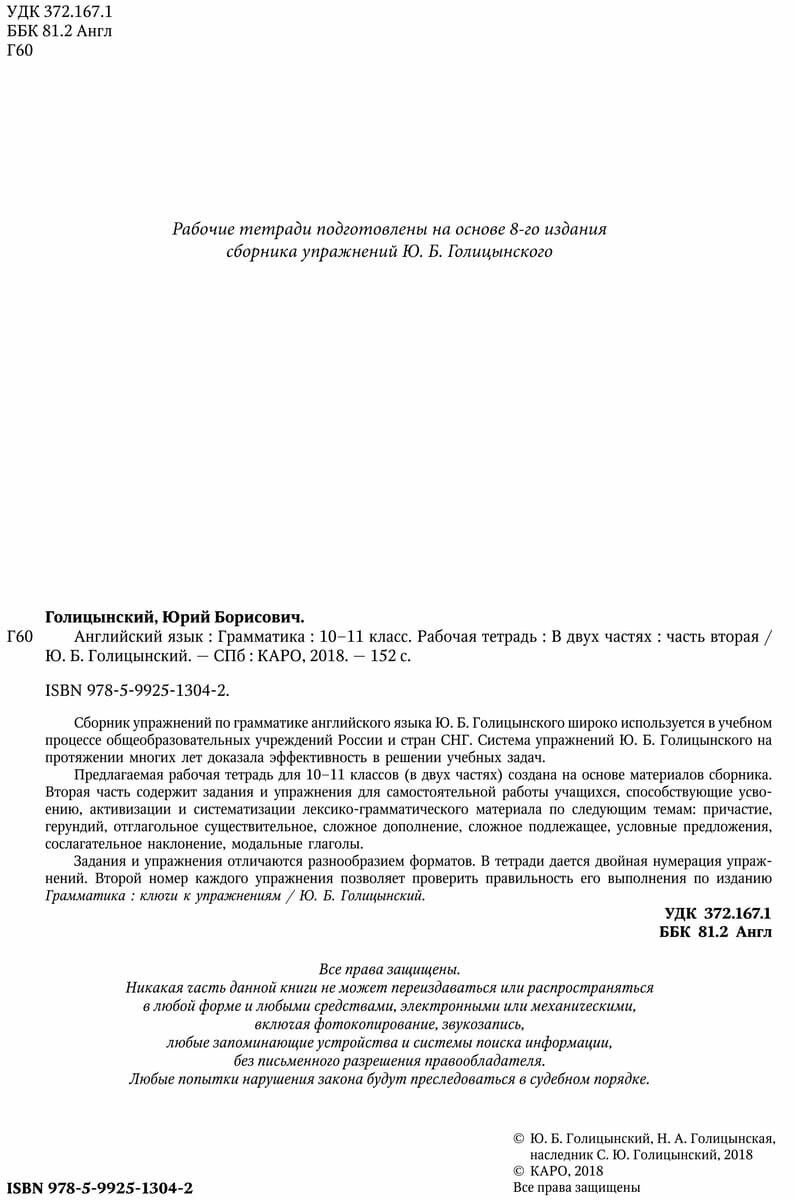 Сборник упражнений по грамматике английского языка Ю. Б. Голицынского широко используется в учебном процессе общеобразовательных учреждений России и стран СНГ. Уникальность методики, использованной в пособии, заключена в возможности тщательной отработки и закрепления материала основных грамматических тем.