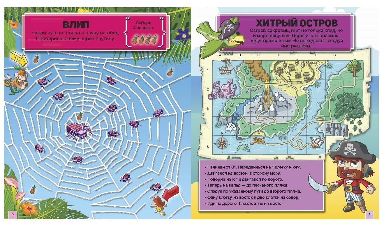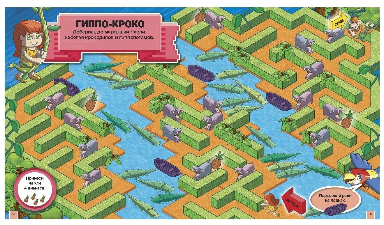 Переплыть через протоки с пираньями, потушить пожар, собрать для мартышки Чарли четыре ананаса... или ввязаться в морской бой, изучить карту острова сокровищ и добраться до вожделенного сундука? Или и то, и другое, да ещё третье в придачу! Открывай поскорее эту книгу многоуровневых лабиринтов и отправляйся в тропики, в весёлое пиратское приключение!