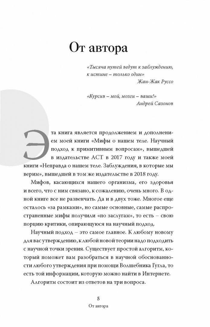 По моему мнению эта третья книжка Сазонова ещё лучше первых двух. Начав с памятного всем гололя-моголя , автор спокойно и уверенно с фактами в руках и с хорошими цитатами из художественных произведений развенчивает множество мифов о вреде или пользе того или иного фактора для здоровья человека. Очень интересна глава о вегетарианстве ( веганстве ) , целиком совпадающая с моим собственным опытом безубойного питания на протяжении многих лет. Спасибо Андрею Сазонову , сумевшему чётко и блистательно сказать о том , что волнует практически всех!