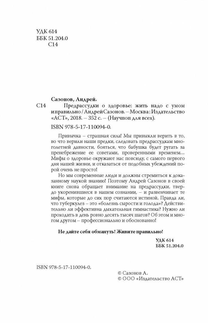 Но мы современные люди и должны стремиться к доказанному наукой знанию! Поэтому Андрей Сазонов в своей книге снова обращает внимание на предрассудки, твердо укоренившиеся в нашем сознании, - и развенчивает те мифы, которые до сих пор считаются истиной. Правда ли, что туберкулез - это "болезнь сырости и голода"? Действительно ли эффективна дыхательная гимнастика? Нужно ли проходить в день ровно десять тысяч шагов? Об этом и многом другом - профессионально и обоснованно!