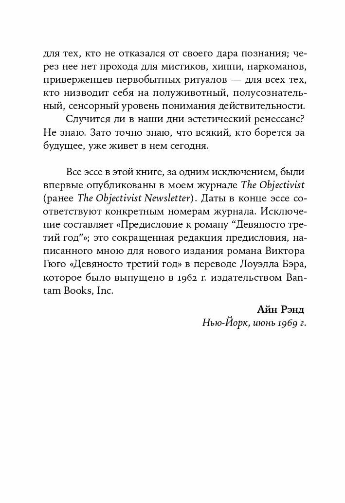 Как писательница, Айн Рэнд знала творческий процесс изнутри, как философ, она считала необходимым его осмыслить. Почему& 171;Анна Каренина& 187; является самым вредным произведением мировой литературы, а Виктор Гюго величайшим писателем-романтиком? В чем цель искусства и кто его главный враг? Можно ли считать искусство& 171;служанкой& 187; морали и что объединяет его с романтической любовью?С бескомпромиссной честностью автор отвечает на эти и другие вопросы и прорывается через туманную дымку, традиционно окутывающую предмет искусства.