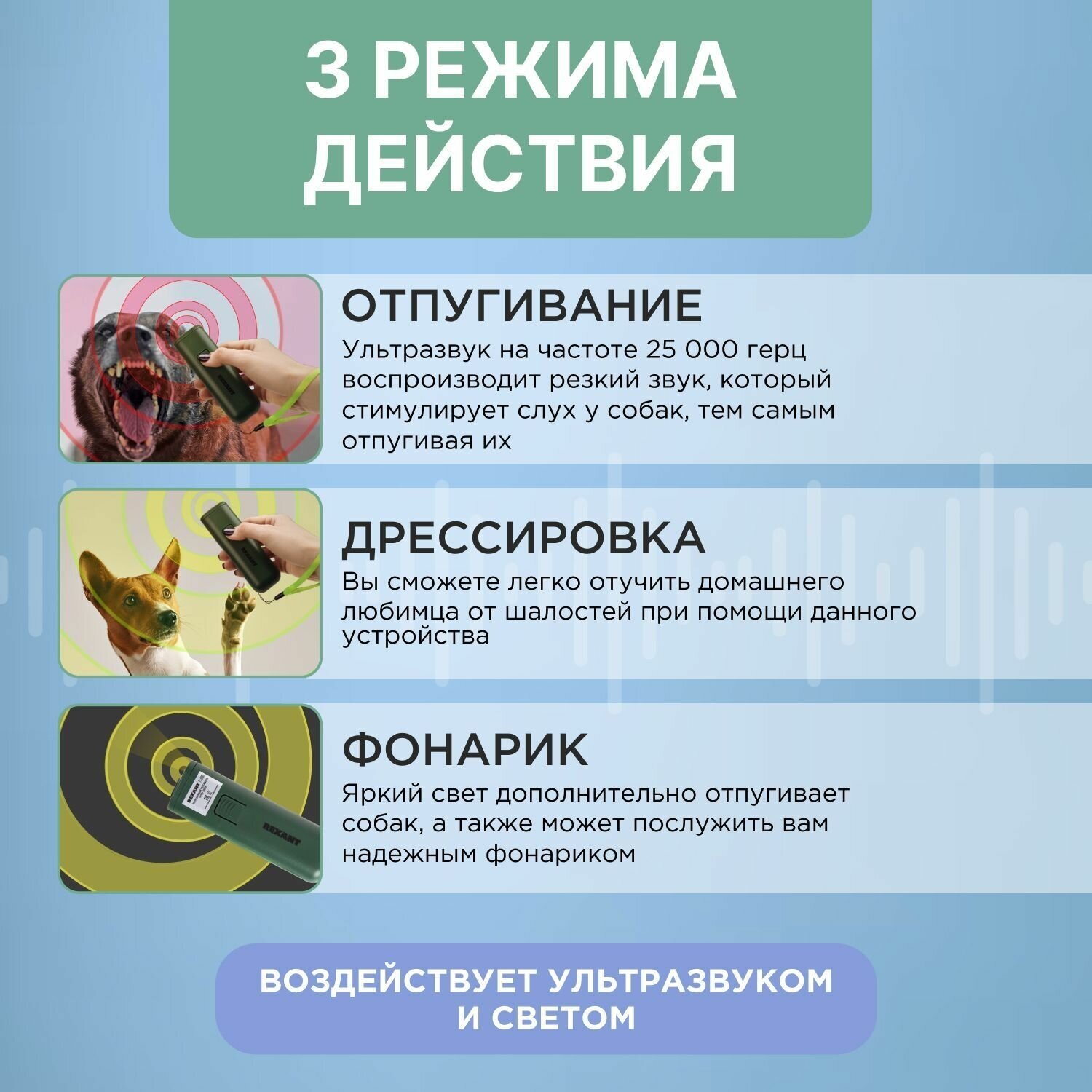 | Назначение | Эффективное средство для защиты от бродячих собак. Гарантированно отпугивает даже самых агрессивно настроенных животных. Компактный и легкий. Он воздействует посредством ультразвука и света. 3 режима работы: отпугивание, дрессировка, фонарик. |
