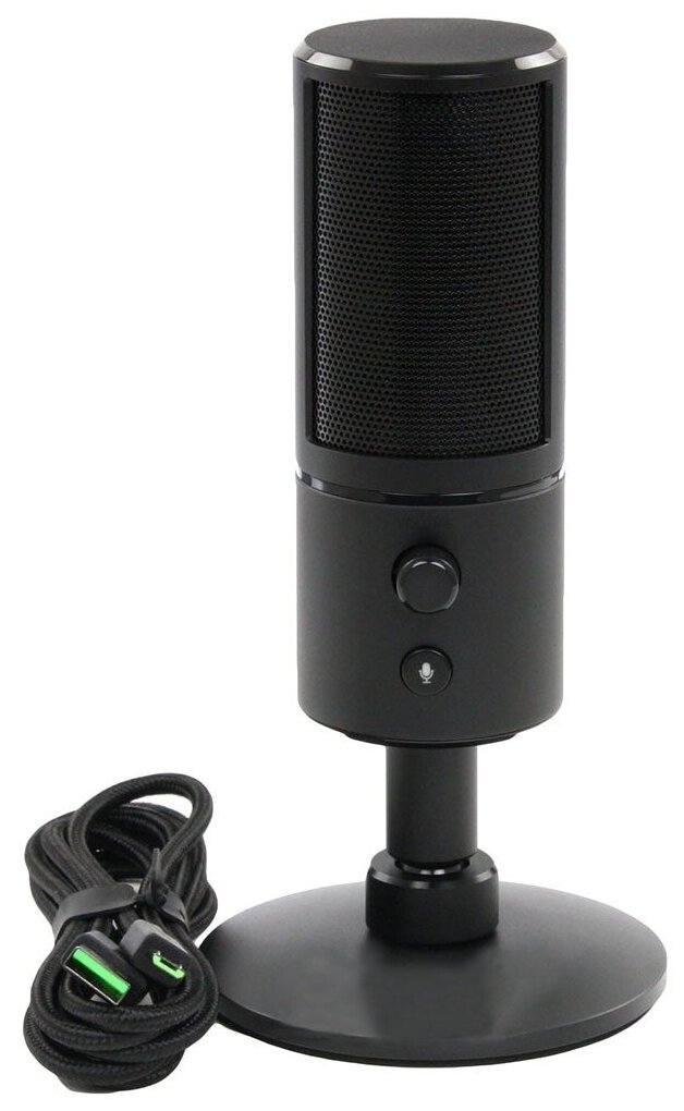 | Прочие особенности и свойства | Микрофон Razer Seiren X идеально подойдёт для стриминга и записи подкастов. Ты можешь брать его в любые путешествия и подключать к ноутбуку даже в общественных местах. Встроенная система стабилизации подавляет большинство шумов из-за движений, делая твои слова действительно чёткими и понятными для слушателей.,,ПРОСТО ПОЛЬЗОВАТЬСЯ,Микрофон соединяется с компьютером через USB-кабель и не требует дополнительного питания. Ты можешь в любой момент отключить его, нажав кнопку на передней панели. Тебе также доступен 3,5-миллиметровый разъём для мониторинга звука через наушники. |