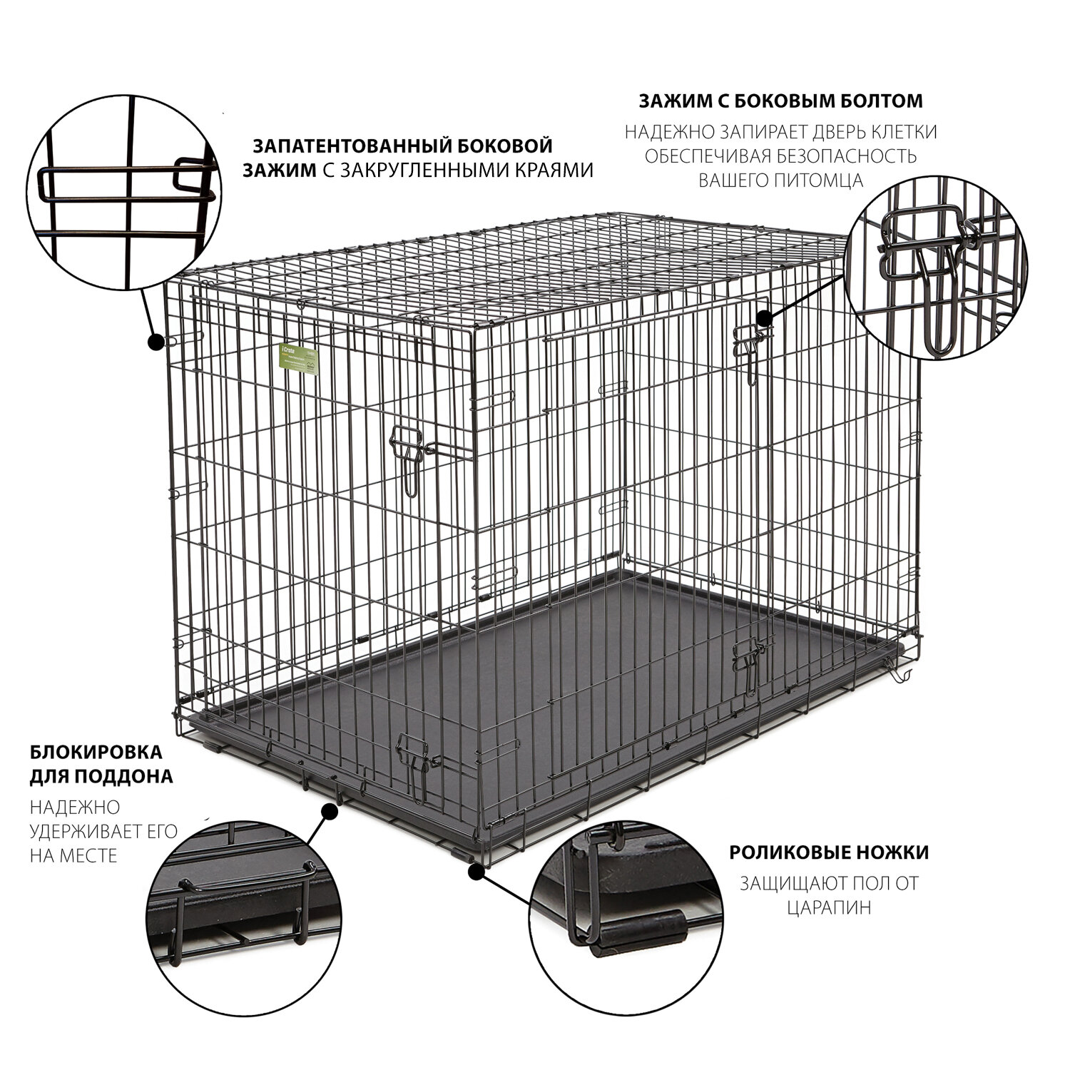 Midwest iCrate клетка 122х76х84 см черная 2 двери.Клетка для домашних животных iCrate с двумя дверьми. Устойчивая, крепкая клетка выполнена из качественного метала, обеспечивающего безопасность животного и хозяина. Двери расположены на смежных боковых сторонах клетки. Удобный, крепкий двойной замок-задвижка позволяет закрыть клетку как снаружи, так и изнутри. В комплект включены: разделяющая панель, пластиковый поддон и специальные пластиковые ручки для удобной транспортировки клетки в сложенном виде. Закругленная угловая защита клетки обеспечивает безопасность питомцам и людям и не повреждает поверхность, на которой размещается. Разделяющая панель позволяет создавать универсальные отсеки. Поддон из композитного пластика легко моется. Клетка легко устанавливается и складывается без использования инструментов. В сложенном виде занимает мало места. Размер клетки - 122 х76 х84h см. Вес - 20,1 кг (22 кг вес с упаковкой). Цвет - черный.