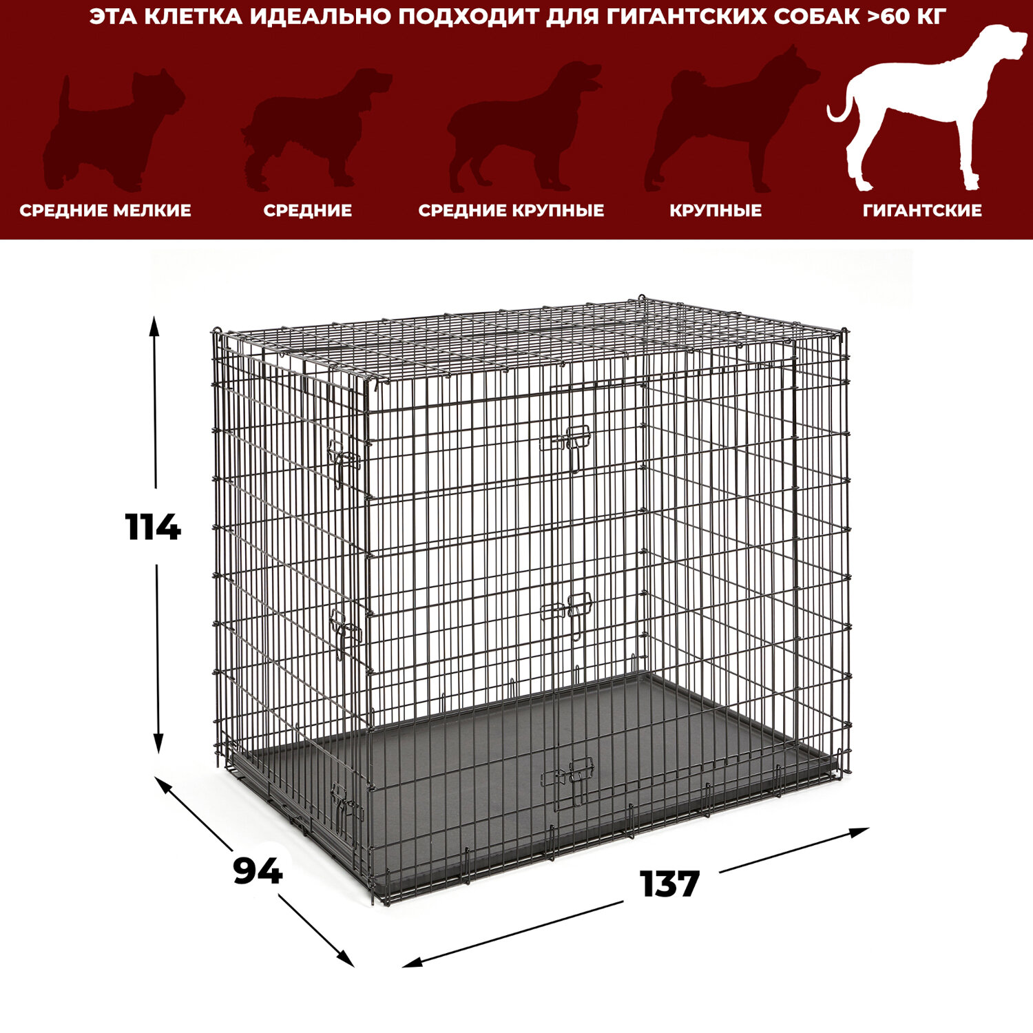 Midwest клетка Solutions 137х94х114h см черная 2 двери.Клетка для собак крупных пород из цинка обработанного долговечным черным покрытием Electro-Coat. Двухдверная. Оснащена безопасным и надежным замком-задвижкой. Закругленная угловая защита клетки обеспечивает безопасность питомцам и людям и не повреждает поверхность, на которой размещается. В комплект включены: крепкий поддон из АВС-пластика, который легко чистится, и специальные пластиковые ручки для удобной транспортировки клетки в сложенном виде.Независимый поддон позволяет его снятие при закрытой двери. Клетка легко собирается и разбирается. В сложенном виде занимает мало места. Толщина прутьев: 3, 5, 6, 7, 9, 12 мм. Размер ячейки: 3,8х12,7 мм. Размер клетки - 137 х 94 х 114 см. Вес – 37,7 кг (вес с упаковкой 41,5 кг).