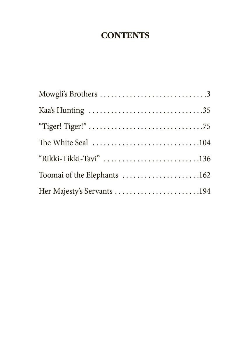 В книгу входят рассказы "Братья Маугли", "Охота питона Каа", "Тигр! Тигр!", "Белый котик", "Дорожная песнь Бандерлогов", "Рикки-Тикки-Тави", "Маленький Тумаи", "Слуги ее величества" и несколько стихотворений.