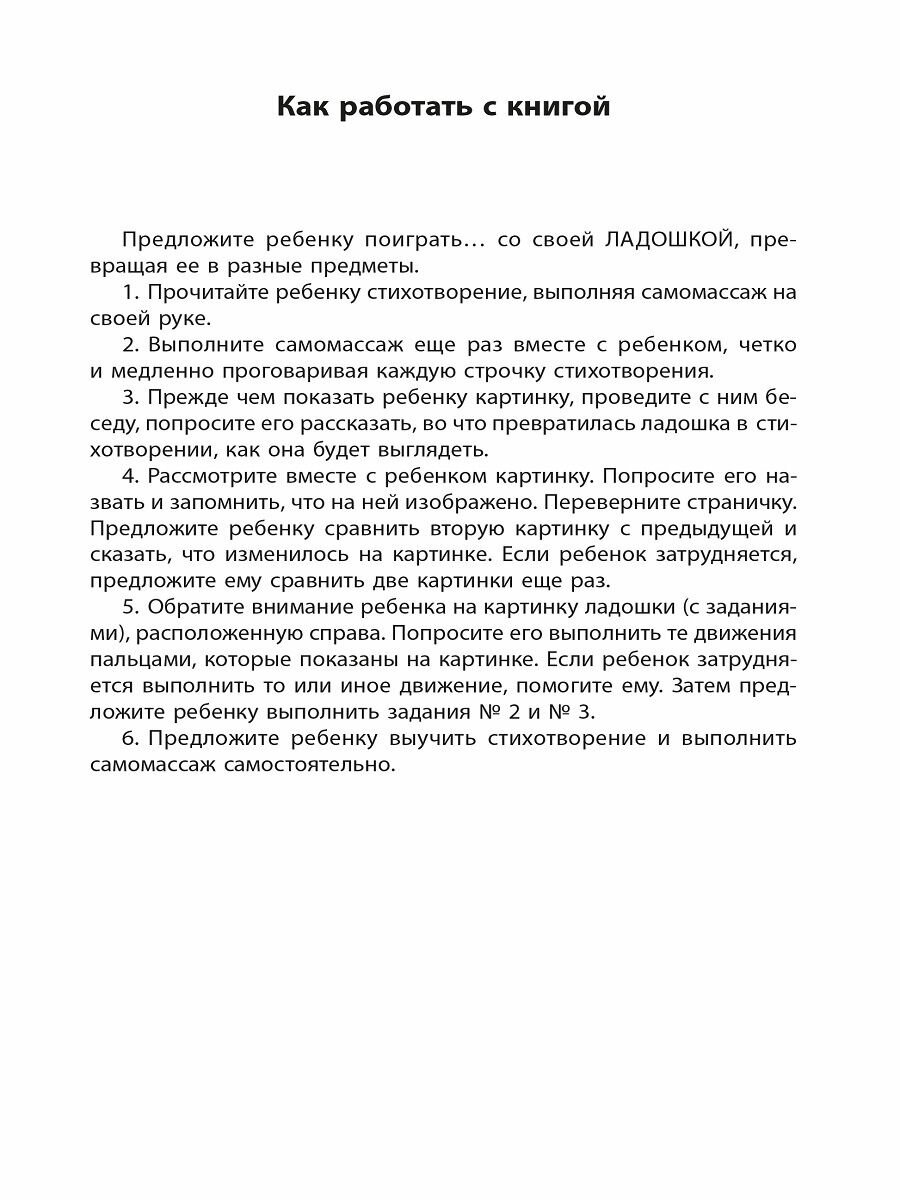 .В нее включены оригинальные забавные стихи о превращениях ладошки и подробное описание техники выполнения массажных движений. В предисловии автор дает инструкцию по работе с детьми. Все стихи сопровождаются замечательными картинками, которые не только привлекут внимание ребенка, но и помогут ему выполнить занимательные задания, направленные на: