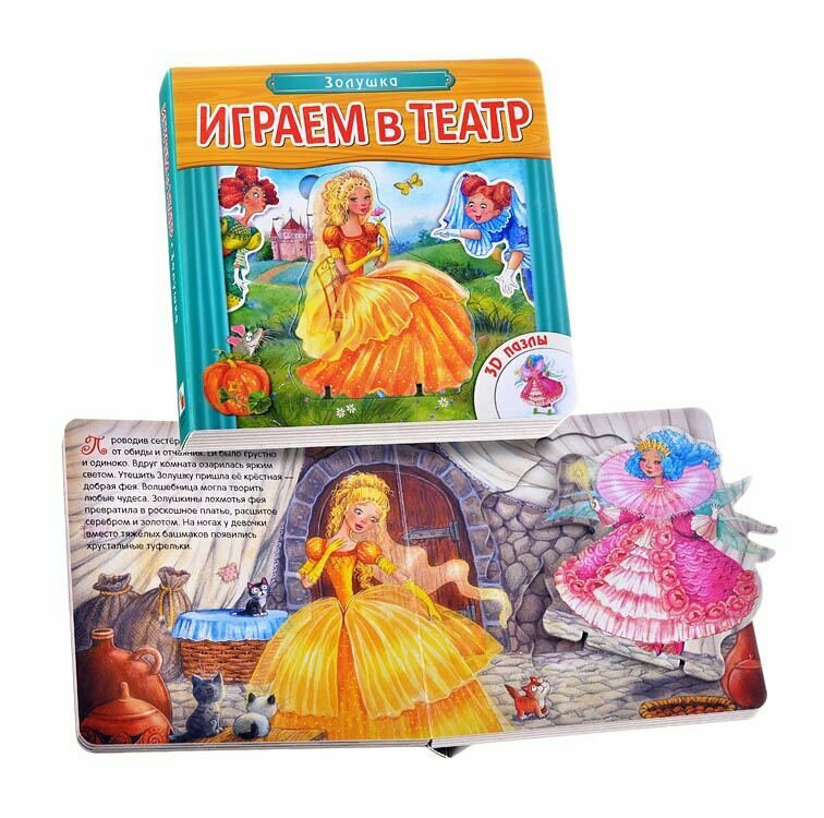 Сказки можно не только читать, в них можно играть! В книге «Золушка» серии «Играем в театр» ребенок найдет шесть картинок-пазлов, которые вынимаются из плотных картонных страничек, а также специальные подставки для фигурок.
