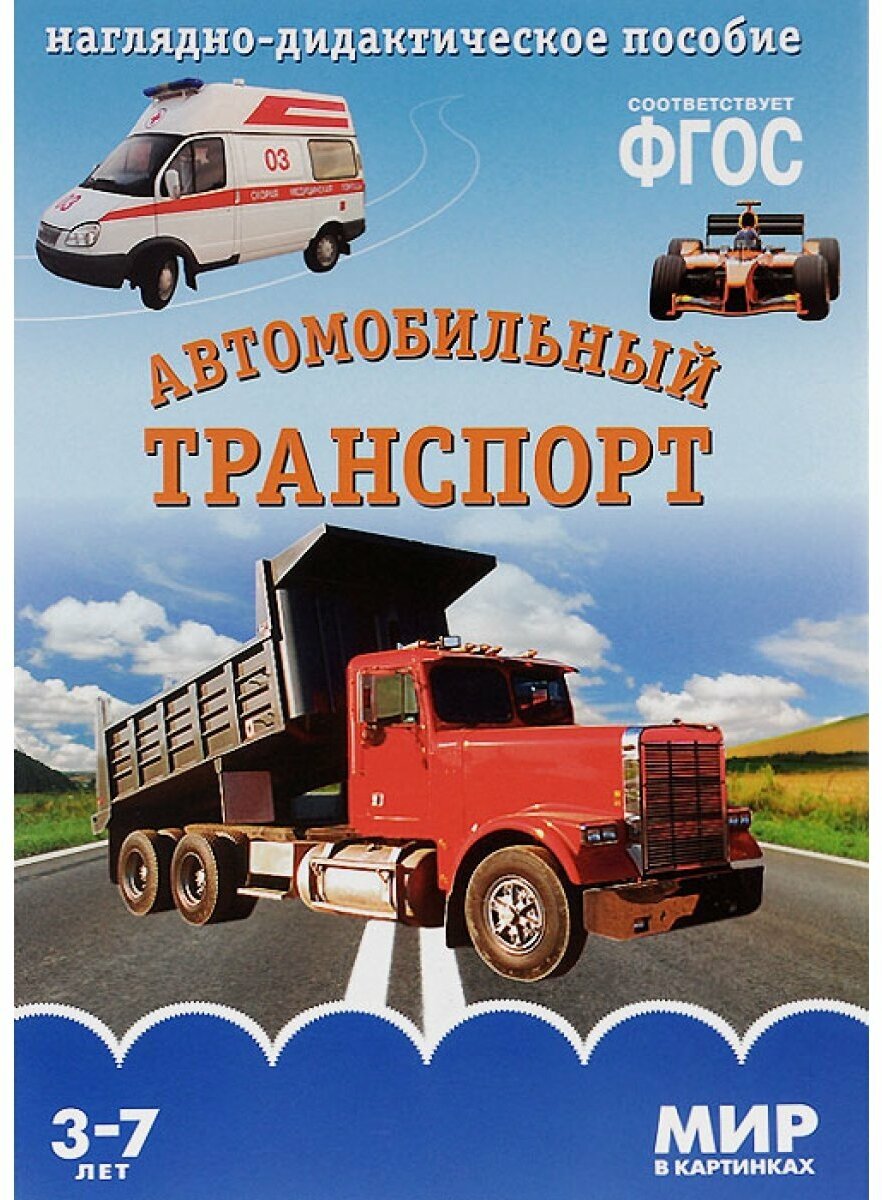 Наглядно-дидактическое пособие «Автомобильный транспорт» серии «Мир в картинках», предназначенное для групповых и индивидуальных занятий с детьми 3–7 лет в детском саду и дома, познакомит детей легковым автомобилем, самосвалом и другими видами машин.