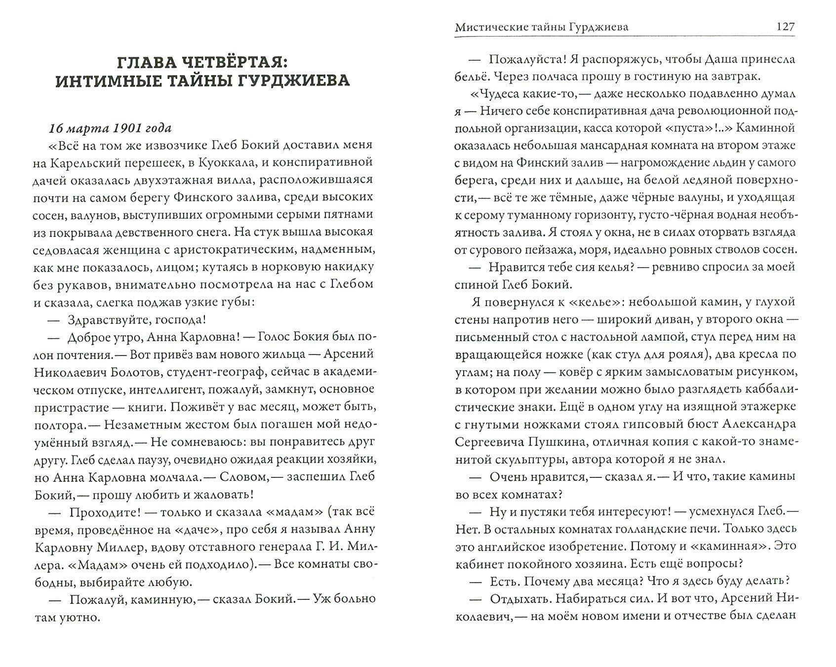 Согласен, тема захватывающая, персонаж эпохальный, но сказочная атрибутика событий, настораживает. Вспоминаются критические характеристики Сталина, встречающиеся у Гурджиева , тонкий и аналитически ум, обрамляющий ёмкие характеристики окружающих его людей, и всё это вносит диссонанс с зачалом повествования. Одним словом на 30-40 странице, в меня вкрался червь сомнения о правдоподобности повествования. К тому же посвящение Книги 100 летию Окт. Революции, лишь усиливает скепсис. Продолжу читать дальше, и отчитаюсь сменилось ли впечатление ….