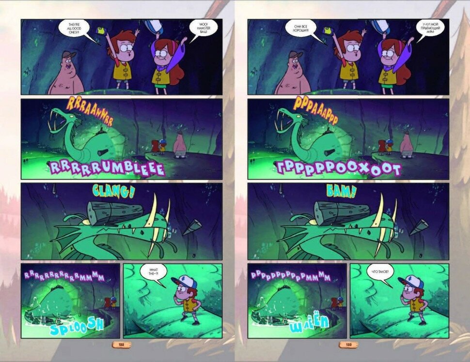 Мне было интересно почитать книгу только на английском, но меня расстроило то что на одной стороне комиксы на русском а на другой на английском, поэтому для меня это слишком легко и я отдала книгу сестре