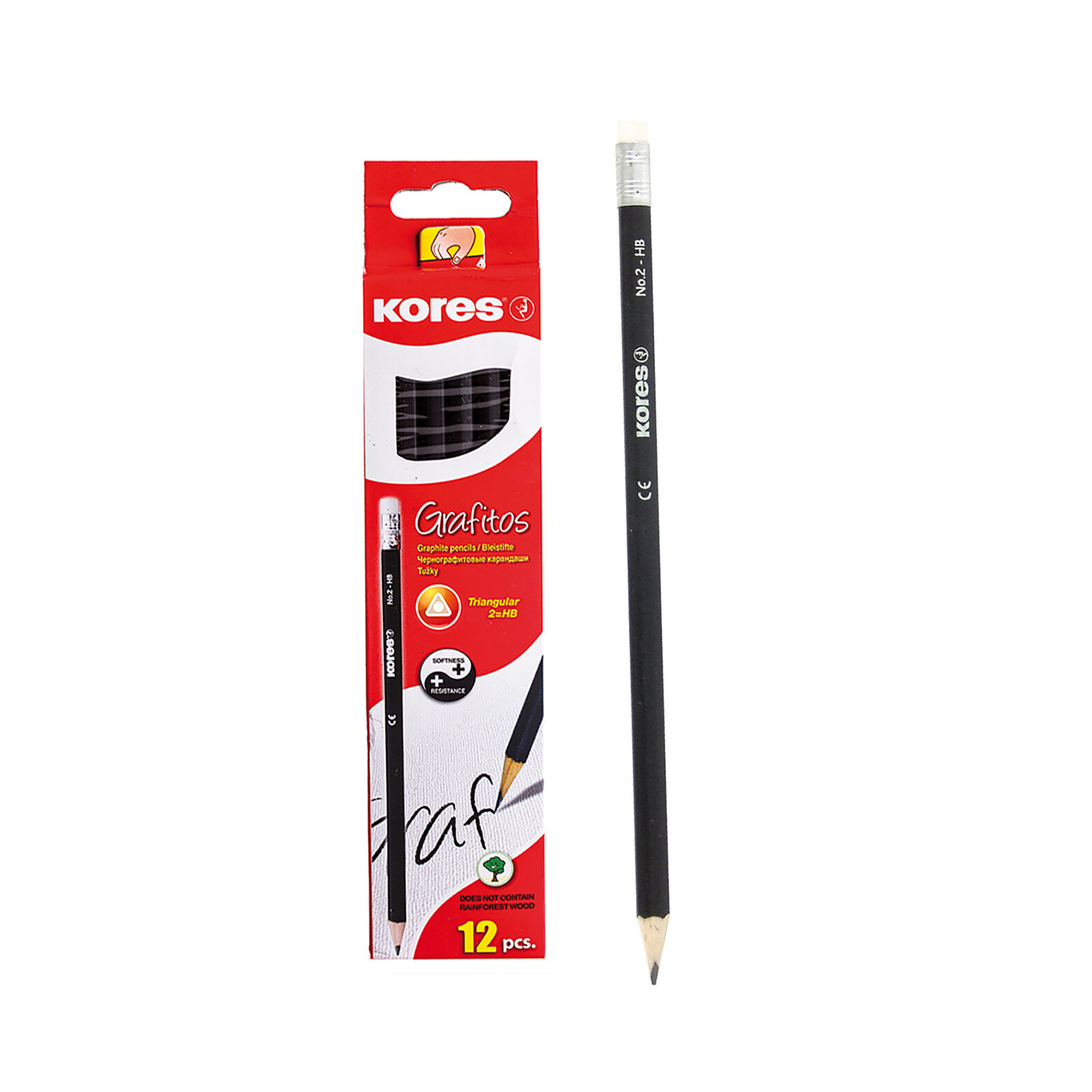 Чернографитовый трехгранный карандаш KORES с ластиком. Карандаш гарантирует гладкое и мягкое письмо. Обладает элегантным матовым черным корпусом. Выполнен из высококачественной древесины, что обеспечивает легкую заточку. Стержень приклеен по всей длине корпуса. Прочный ударостойкий грифель. Не царапает бумагу. Идеально подходит для дома, офиса и школы. Диаметр грифеля: 2,2 мм.
