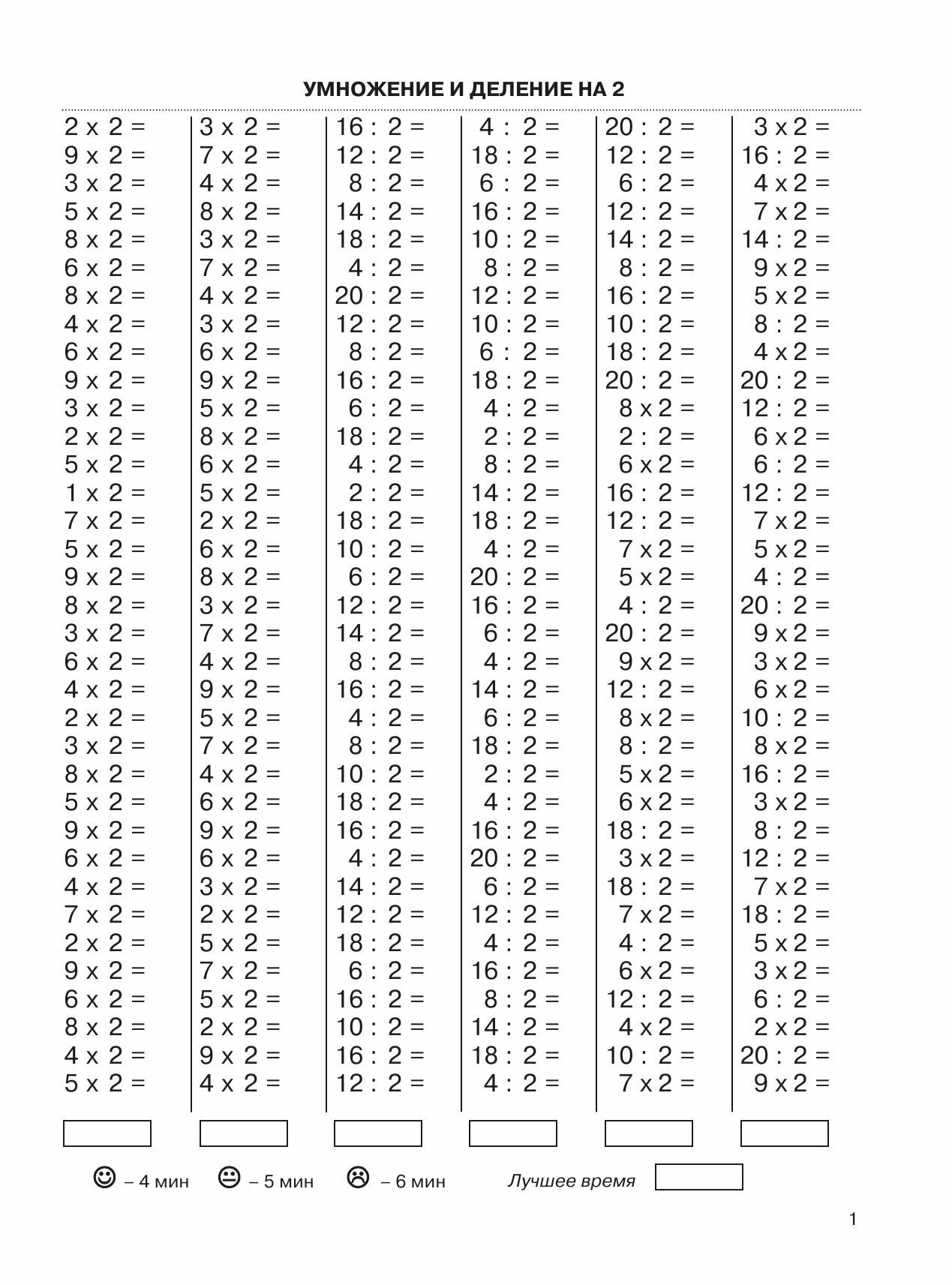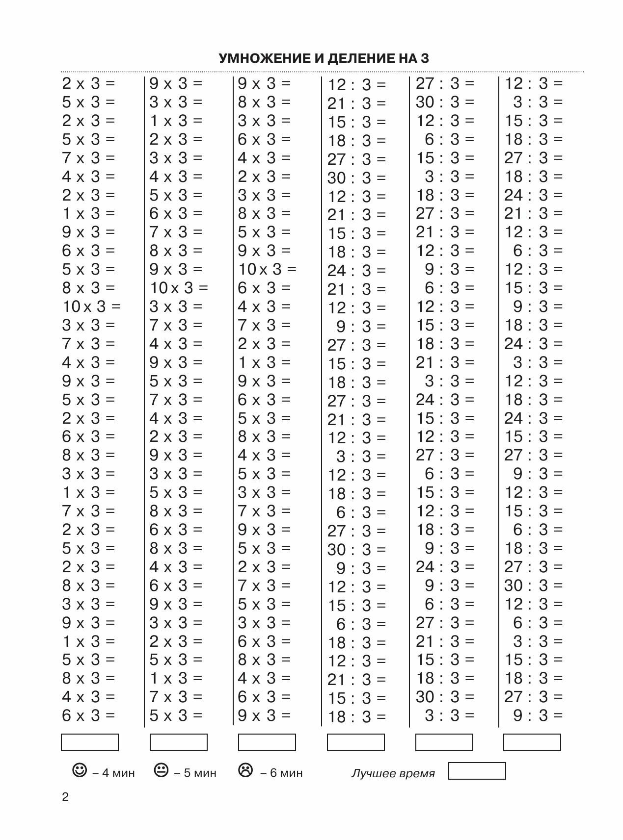 На каждой странице приведены 6-7 столбиков, в среднем по 35 примеров. В конце столбика записывается время, потраченное учеником на решение. В левом нижнем углу обозначены контрольные цифры: идеальное время решения одного столбика, удовлетворительное и результат, который должен заставить ученика задуматься.