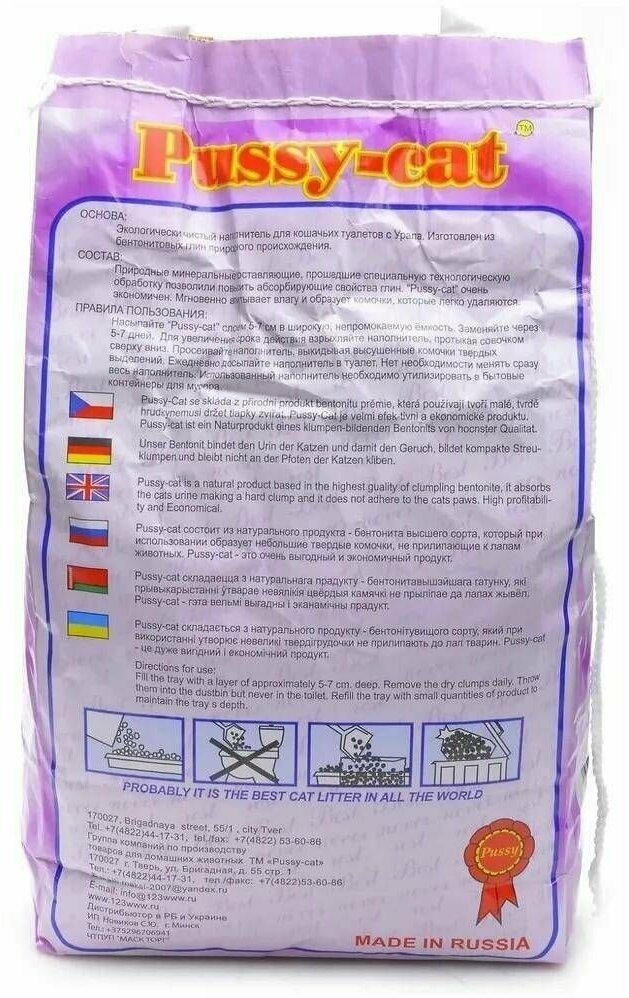 Комкующийся наполнитель Pussy-cat с номинальным объемом поглощения 4.5 л – натуральный продукт от российского бренда. Подходит для кошек любых пород, не вызывает аллергических реакций и создан на основе минералов природного происхождения. Наполнитель мгновенно впитывает влагу, не позволяет появляться неприятным запахам и не имеет в составе ароматизаторов. Гранулы расходуются экономично: Pussy-cat не требует ежедневной замены. Продается продукт в бумажной упаковке с ручкой, поэтому его удобно хранить, переносить и насыпать в лоток. Особенности Изготовлен из бентонитовых глин природного происхождения, специально обработанных для усиления абсорбирующих свойств. Соответствует российским стандартам качества. Образовывает комочки, которые легко удаляются. Насыпать необходимо слоем 5-7 см. Утилизируется в бытовые контейнеры. Можно не менять наполнитель полностью. Срок годности не ограничен. Не прилипает к лапам животных.