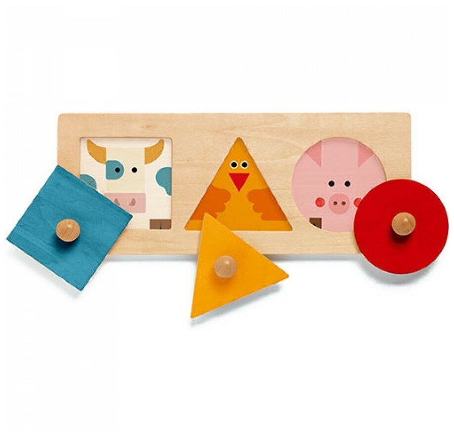 Рамка-вкладыш Формы от французского производителя Djeco - замечательная развивающая игра для малышей от 1 года, которая поможет в изучении различных геометрических форм и сопоставлении цветовой гаммы. На деревянной дощечке расположены три вкладыша разной формы - квадрат, треугольник и круг. Под вставками спрятаны изображения коровы, поросенка и курочки. Для каждой фигуры ребенок должен найти свое место, ориентироваться можно также по цветовой гамме на изображении животного. Круглые ручки на кружках-вставках позволят ребенку удобно и быстро захватить деталь маленькими детскими пальчиками. Рамка-вкладыш обязательно понравится малышу, он будет с удовольствием рассматривать животных и подбирать вставки по форме. Игра с рамками-вкладышами способствует развитию сенсорного восприятия и пространственной координации, непосредственно развивает мелкую моторику детских ручек. Деревянные рамки-вкладыши обучают основам классификации и логике, пространственной ориентации, учат различать предметы по форме и цвету. Деревянная рамка пазл от компании Джеко выполнена из высококачественного дерева, окрашена безопасными для здоровья малыша красками.