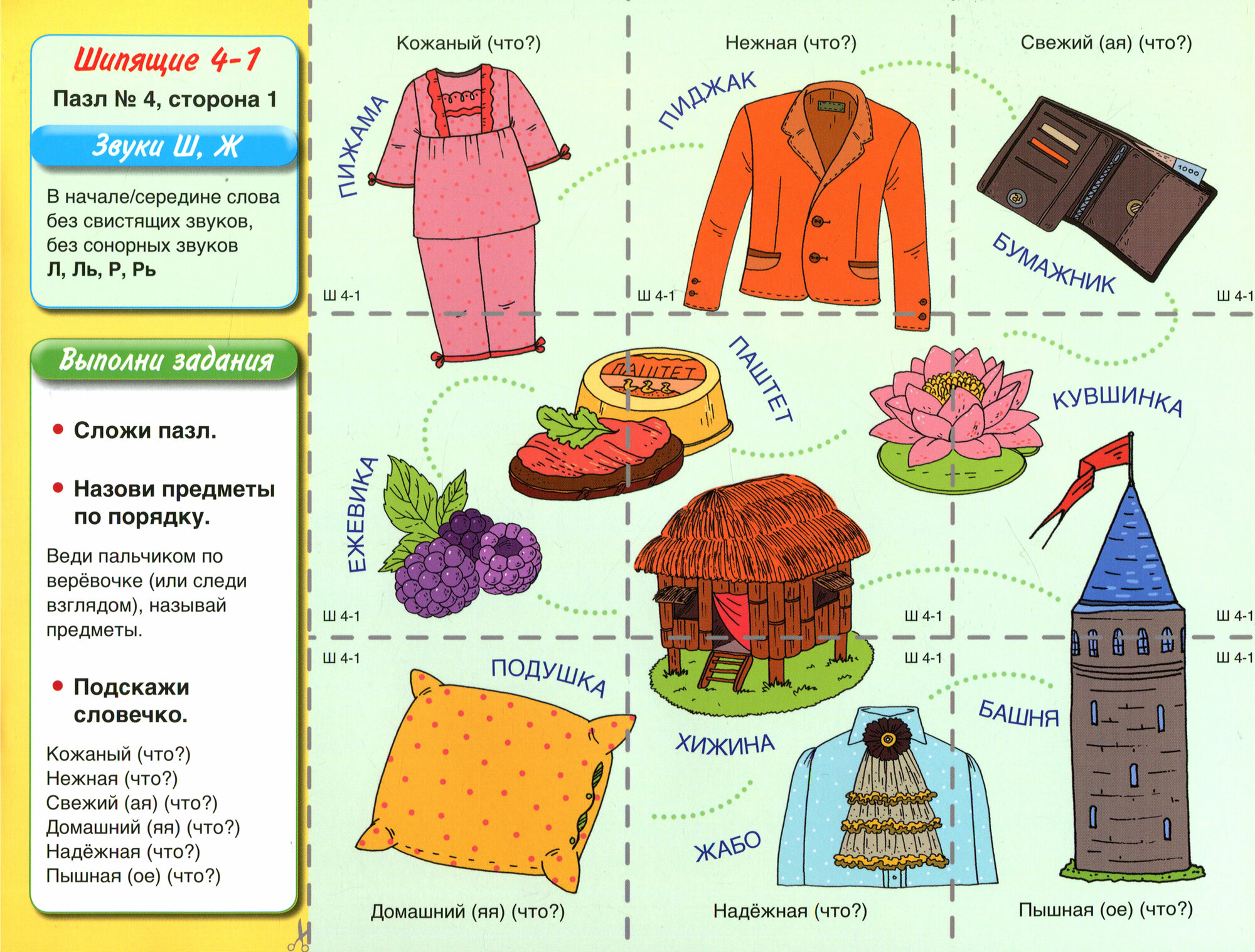 Издание содержит игровой дидактический материал (разрезные карточки-пазлы). Предлагаемый материал в игровой форме способствует закреплению в речиправильного произношения, активизации и обогащению словарного запаса.