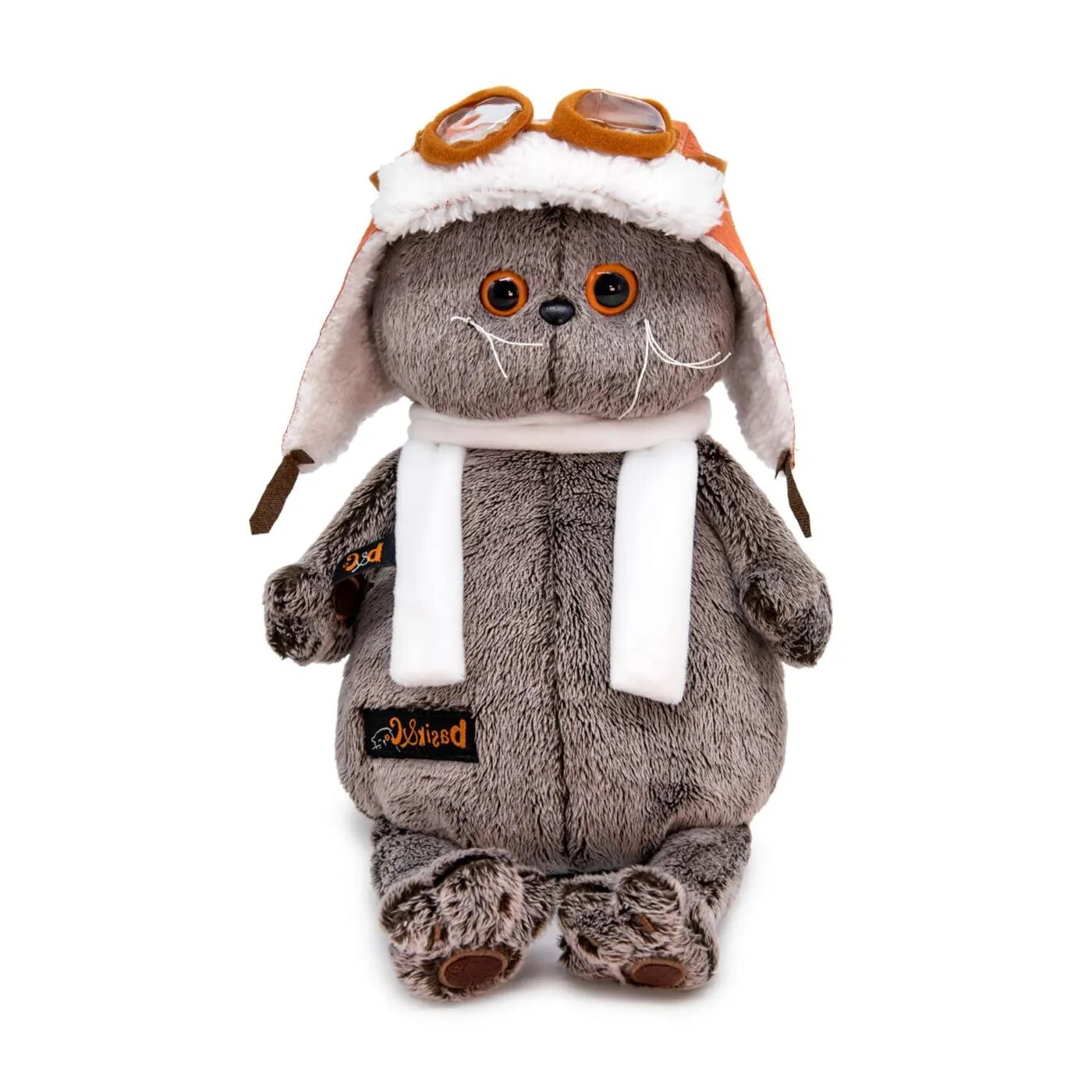 Мягкая игрушка Басик в шлеме и шарфе подарит малышу немало прекрасных мгновений. Дети очень трепетно относятся к домашним животным, особенно они любят котов и собак и часто просят своих родителей приобрести им такого друга. Однако домашние питомцы не всегда хорошо влияют на детей - они могут поцарапать и даже вызвать аллергическую реакцию, поэтому приходят на помощь мягкие игрушки, очень похожие на настоящих питомцев. С этим шотландским вислоухим котиком можно играть, отдыхать и засыпать в обнимку, рассказывая свои секреты. У него густая плюшевая шерстка, которую так приятно гладить. У Басика круглые медовые глазки, маленькие ушки и черный носик. Кот в летном шлеме из рыжей искусственной замши на белом меху. В комплекте - длинный белоснежный шарфик. Мягкие игрушки очень полезны для малышей, потому что весьма позитивно влияют на детскую нервную систему, прогоняя всевозможные страхи.