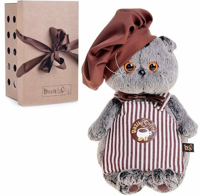 Мягкая игрушка "Басик-бариста" от бренда "Басик и Ко" исполнена в виде симпатичного серого котика, который выглядит очень деловито. Кот по кличке Басик - настоящий специалист своего дела и хозяин уютного заведения. Он готов предложить посетителям ароматный кофе, сваренный по эксклюзивному рецепту. На нем надеты стильный фартук и колпак цвета кофе, а также элегантная бабочка. Игрушка сшита из высококачественных искусственного меха, наполнителя и текстиля, она представлена в стильной подарочной упаковке.