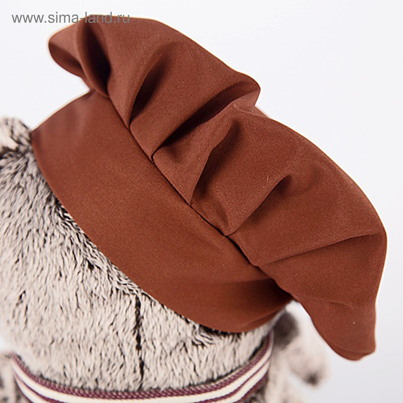 Басик-бариста в стильном фартуке из плотного хлопка в бело-коричневую полоску. На фартуке оригинальный принт с чашечкой кофе и кофейными зёрнами и надписью: Басик любит кофе. На коте объёмный колпак из смесовой ткани кофейного цвета, а также галстук бабочка шоколадного цвета из шелковистого сатина.