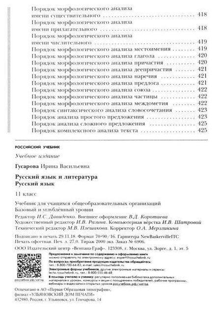 Русский язык и литература. Русский язык. Базовый и углублённый уровень. 11 класс. Учебник (Гусарова Ирина Васильевна); ВЕНТАНА-ГРАФ, 2019