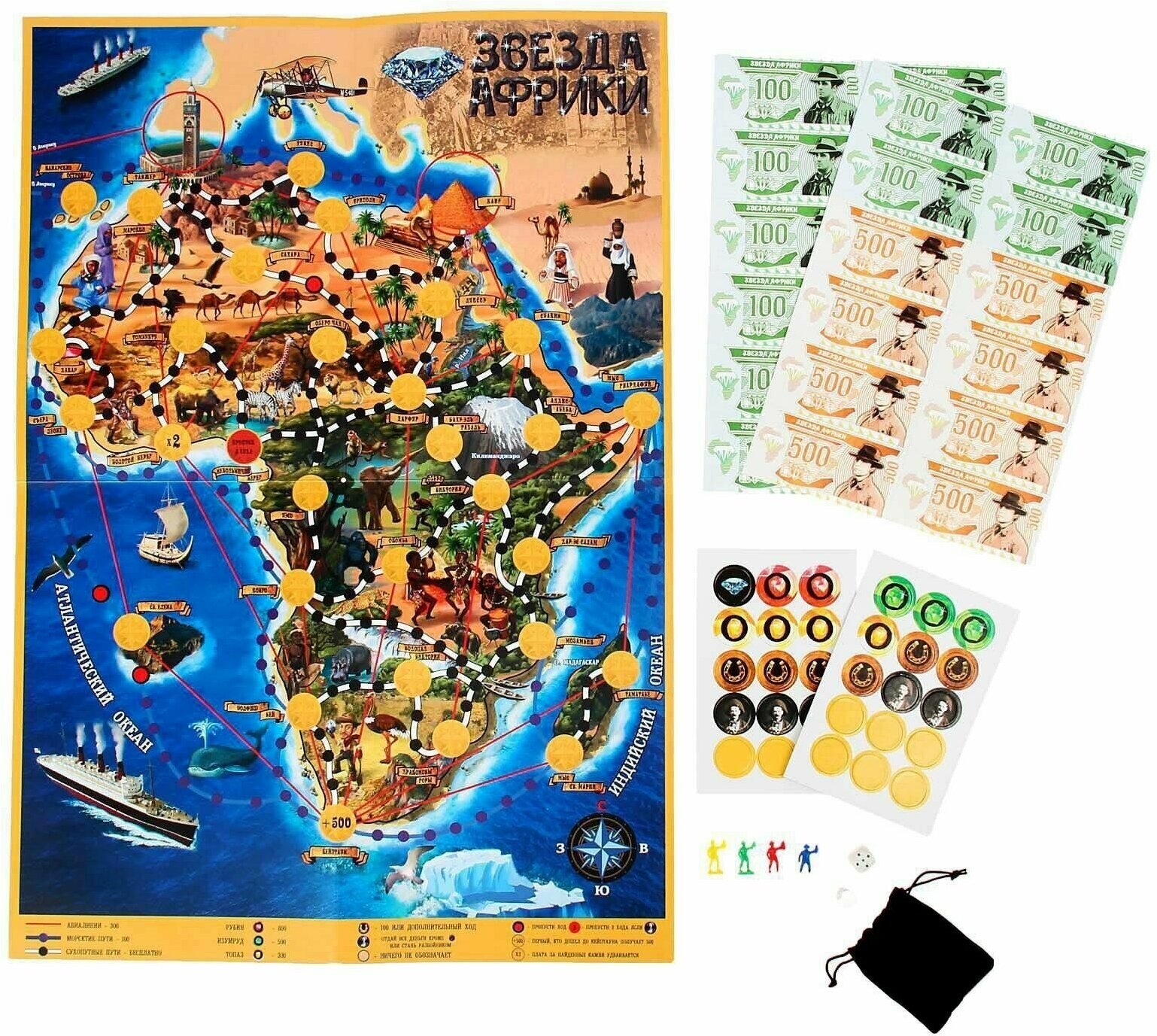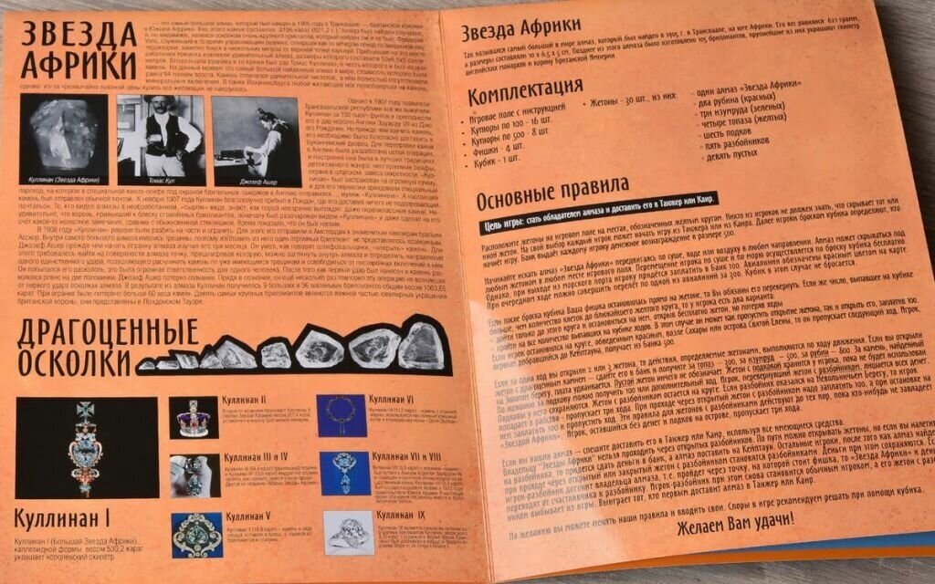 | Состав набора | 4 фишки-человечки, настоящий драгоценный камень (горный хрусталь), мешочек для камня, доработанная карта, игровое поле с инструкцией, 16 купюр по 100, 8 купюр по 500, 30 жетонов, кубик |