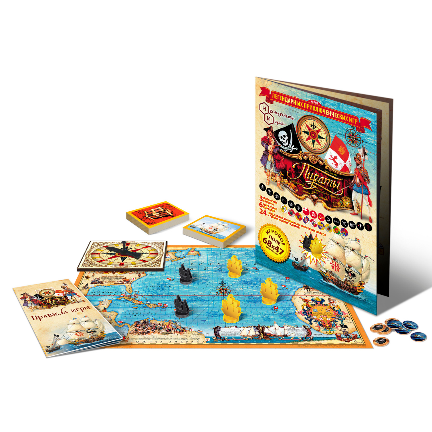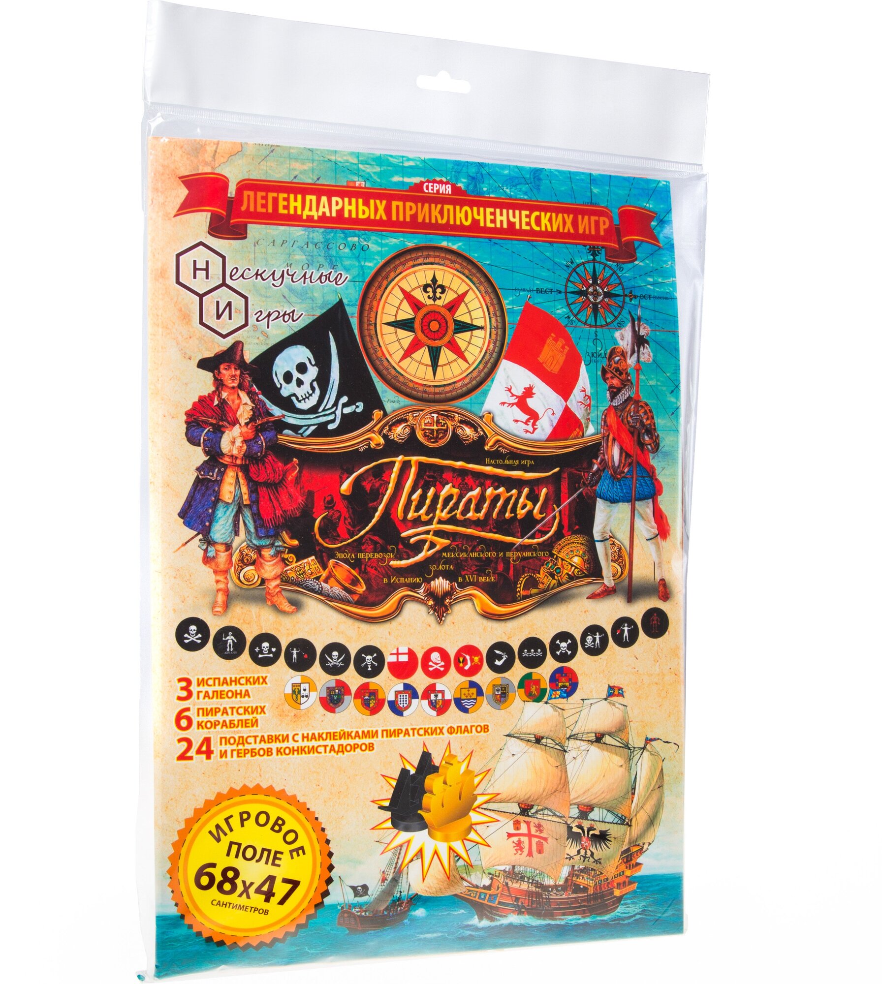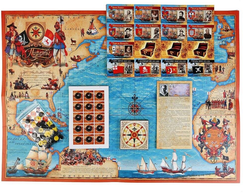 Настольная игра Пираты создана по мотивам одноименной игры, разработанной еще в 1934 году художником В. М. Голицыным, именно поэтому каждый элемент игрового набора выделяется тонкой дизайнерской проработкой. Например, поле для игры напоминает настоящую карту сокровищ, специальная вертушка похожа на компас с изображением розы ветров. Девять фишек в виде кораблей, двадцать четыре карточки с реалистичными изображениями пиратов и конкистадоров и еще столько же наклеек на суда - все это и многое другое поможет сделать процесс намного более увлекательным и захватывающим, полным почти настоящих приключений.