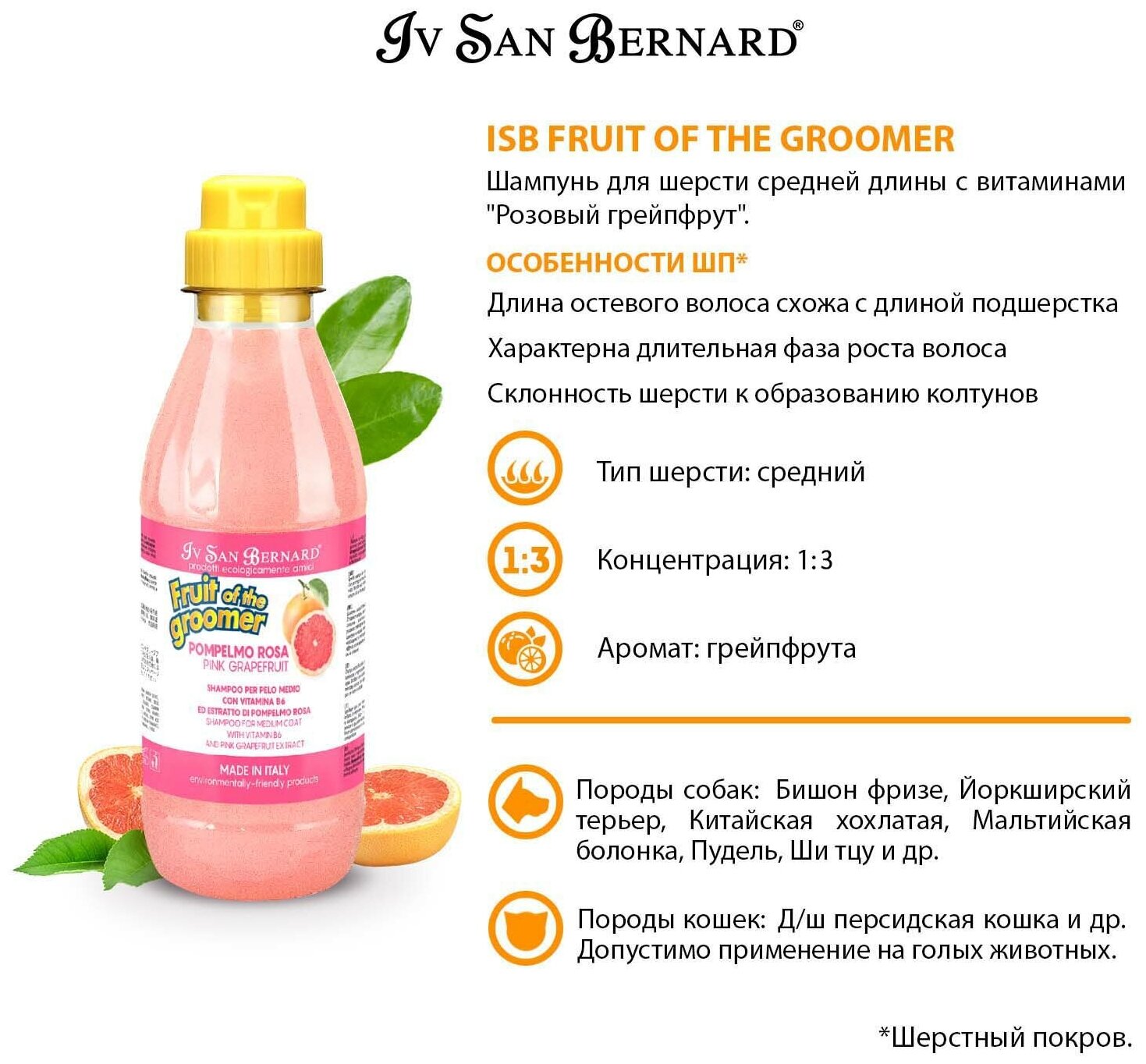 ISB Fruit of the Grommer Pink Grapefruit Шампунь для шерсти средней длины с витаминами 500 мл Шампунь разработан для частого применения. Обладает очищающим и тонизирующим эффектами. Оставляет шерсть блестящей и ухоженной. Полезные свойства растительных компонентов цитрусовых смешаны с защитным и укрепляющим действием витаминов. Природный дезодорирующий аромат розового грейпфрута создает приятное настроение. Способ применения: нанести достаточное количество шампуня на хорошо смоченную шерсть массирующими движениями. Оставить на 3 мин., смыть водой. При необходимости повторить. Для удобства применения можно разбавить шампунь водой 1:3. Для наилучшего эффекта после шампуня используйте маску - восстановитель Розовый грейпфрут с витаминами.