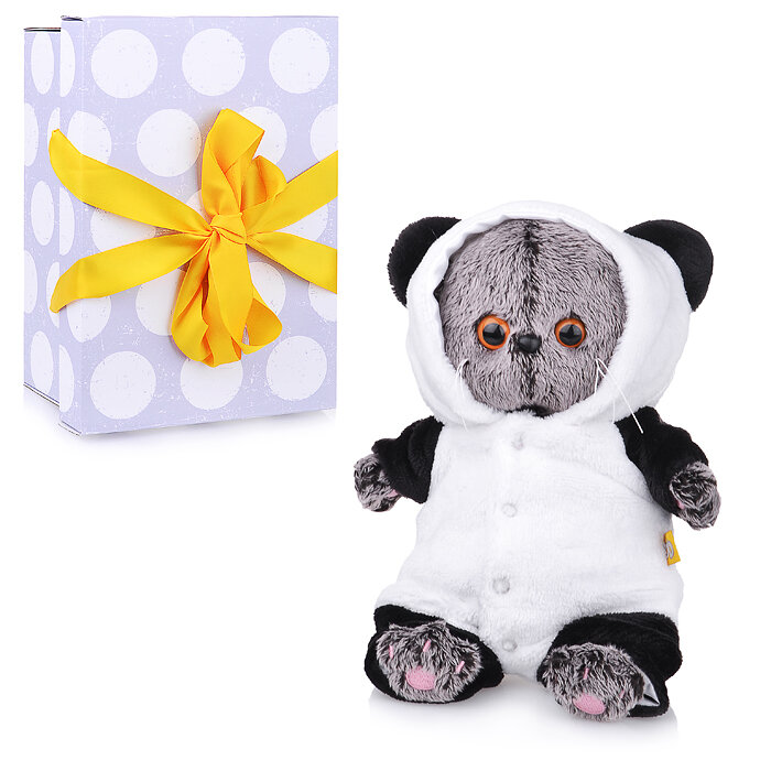 Этот малыш - всеми любимый кот Басик, только в самом раннем детстве. Комбинезончик Панда делает этого котёнка ещё более трогательным. Игрушка выполнена из качественного безопасного материала, настолько приятного и мягкого, что ребенок будет брать его с собой на прогулку или в кроватку и спать в обнимку.