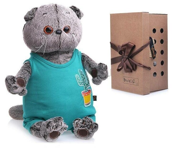 Басик - известный персонаж и признанный любимец публики. Это милая мягкая игрушка нравится не только детям, но и взрослым. Большая голова с выразительными круглыми глазками, смешные маленькие лапки и всегда стильные аксессуары - стоит только взглянуть на этого котика, и он обязательно завоюет и ваше сердце. Мягкая игрушка Кот Басик в изумрудном комбинезоне с кактусом выполнена из невероятно мягкого материала, очень приятного на ощупь.