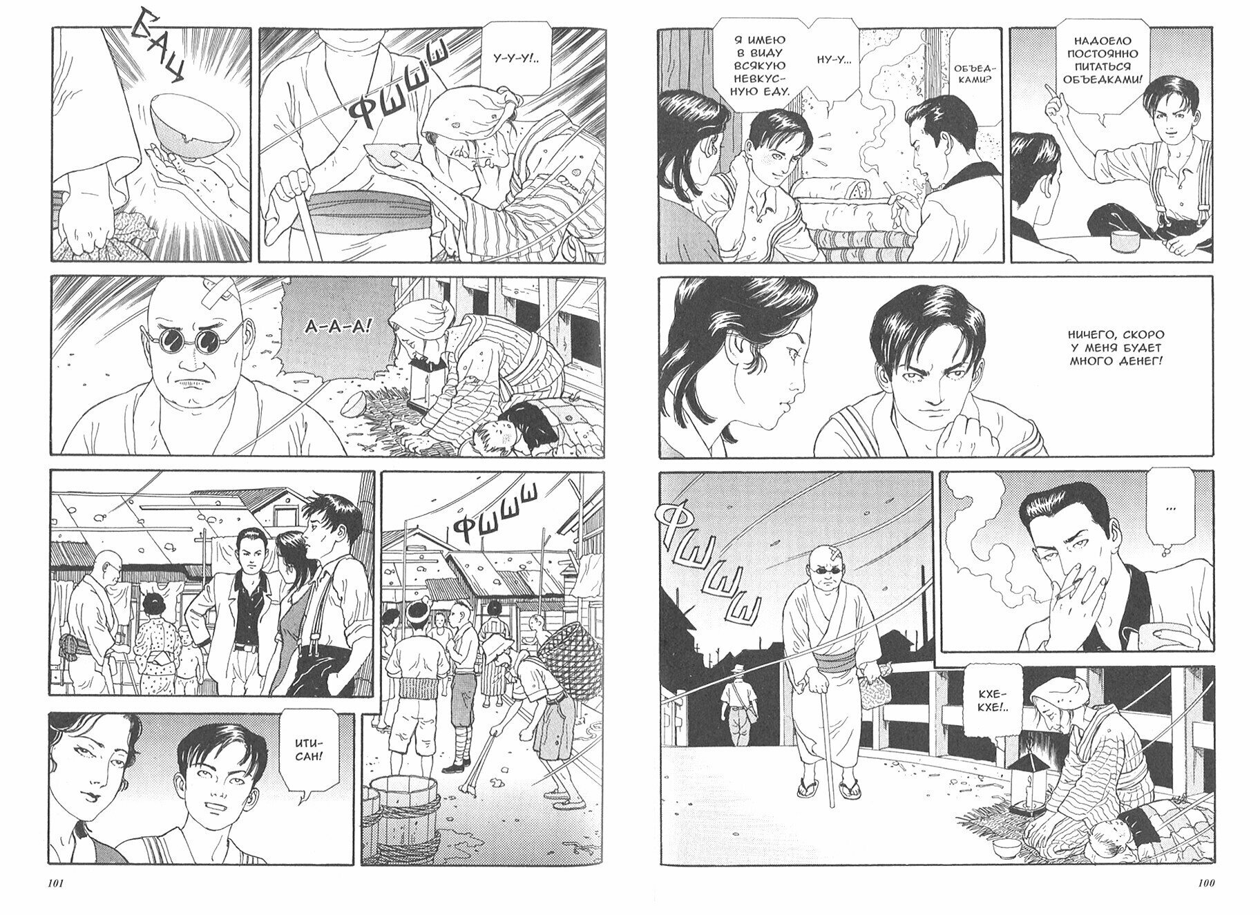 Рекомандую всем поклонникам "демона японской манги", а так же любителям японской литературы, т.к. 3 из 4 произведений в данном сборнике базируются именно на рассказах японских писателей разных эпох. Однако мне больше всего в данной манге понравилась оригинальная, четвертая история Маруо. Если вы никогда ранее не сталкивались с творчеством данного автора, рекомендую сначала ознакомиться с ним в интернете, т.к. его творения весьма специфичны и не каждому придутся по душе. Тут вам и страдания, и насилие, всевозможные пороки и прочее… Графика так же не типична для манги, на мой взгляд, Маруо больше художник, чем мангака. Конкретно в издании "фабрики комиксов" не понравилась слишком тонкая суперобложка, хоть она матовая и очень приятная наощупь на ней легко остаются глянцевые царапины просто даже от того, если вы неудачно держали книгу в руках или если провели ей по поверхности стола, так же хочу отметить слишком "грубые" шрифты в переводе надписей на вывесках и прочем. Выглядит совсем не художественно и портит впечатление. Бумага в целом неплохая, запах не сильно химозный. Очень большой плюс, что манга продается в пленке, которая хорошо защищает ее от механических повреждений.