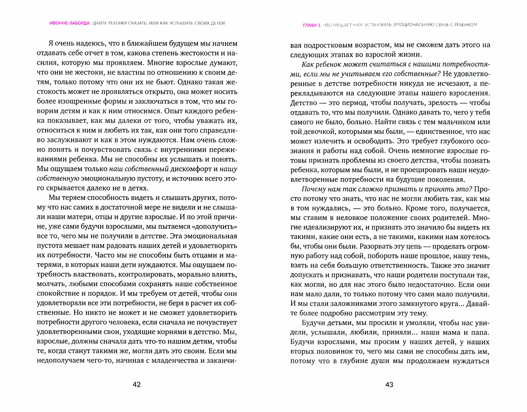 Испанский психотерапевт Ивонне Лаборда разработала технику "7 шагов эмоциональной близости", которая помогла ей наладить отношения со своим ребенком и избавиться от неуверенности и чувства брошенности, идущих из ее собственного детства. На первый взгляд эти шаги просты: говорить правду, признавать свои слабости, общаться с детьми, как со взрослыми, разделять их мечты и увлечения, принимать всех вокруг такими, какие они есть, и т. д. Но когда вы начнете применять их в жизни, то заметите, что дети все чаще приходят к вам за советом или для разговора по душам. Они сами расскажут, как прошел их день в школе, что они делали в гостях у бабушки с дедушкой и с кем гуляли в субботу вечером. Вам не нужно будет устраивать им "допрос" или без конца контролировать.
