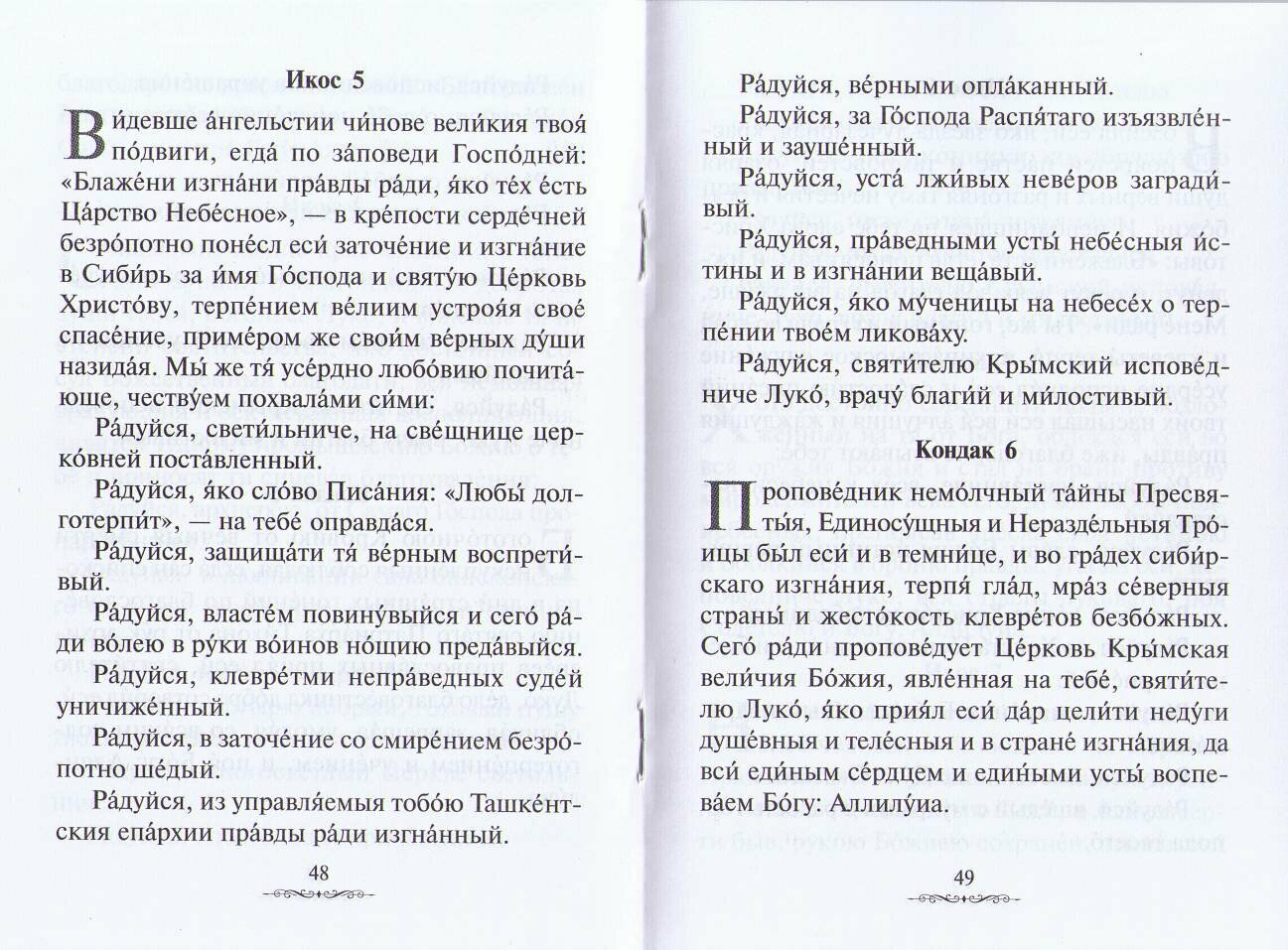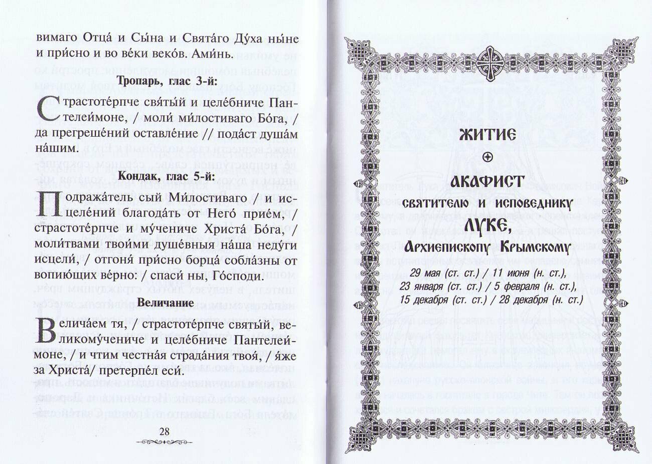 Издание содержит акафисты и жития святых врачей, целителей, бессребреников: великомученика и ценителя Пантелеимона, святителя Луки (Крымского), преподобного Агапита Печерского, врача безмездного. Шрифт — русский (гражданский), с ударениями.