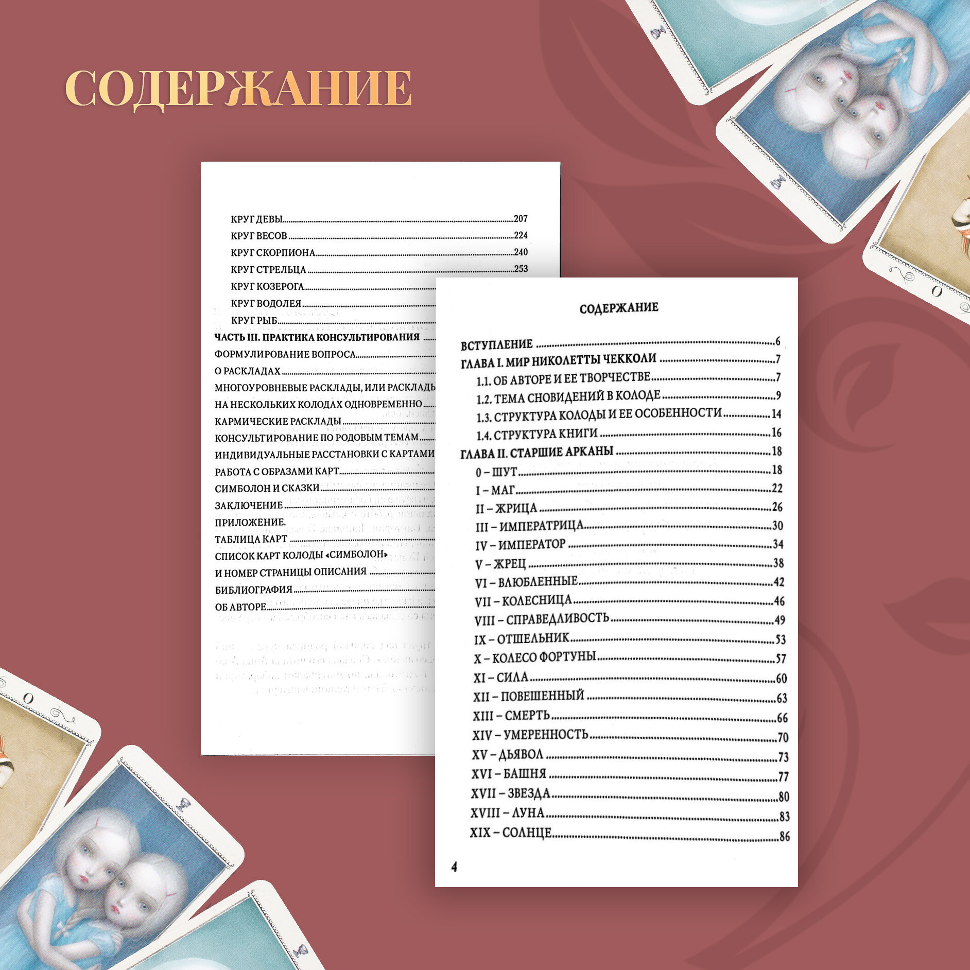 Немного введения, где Елена Коломенская рассказывает о своем знакомстве с колодой, далее идет пару страниц о самой Николетте и ее творчестве, о том, что по мнению автора - колода широко раскрывает тему сновидений (я не могу с ней согласится, т.к. я не работала с колодой в этом направлении), этой теме посвящено около 6 страниц.