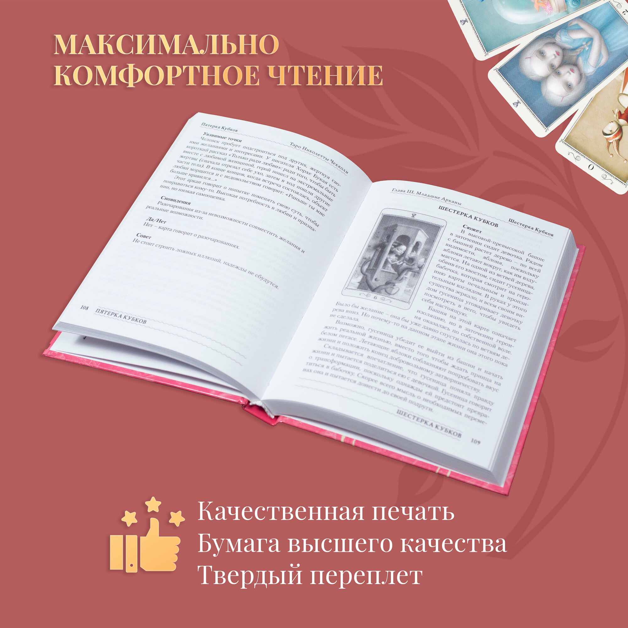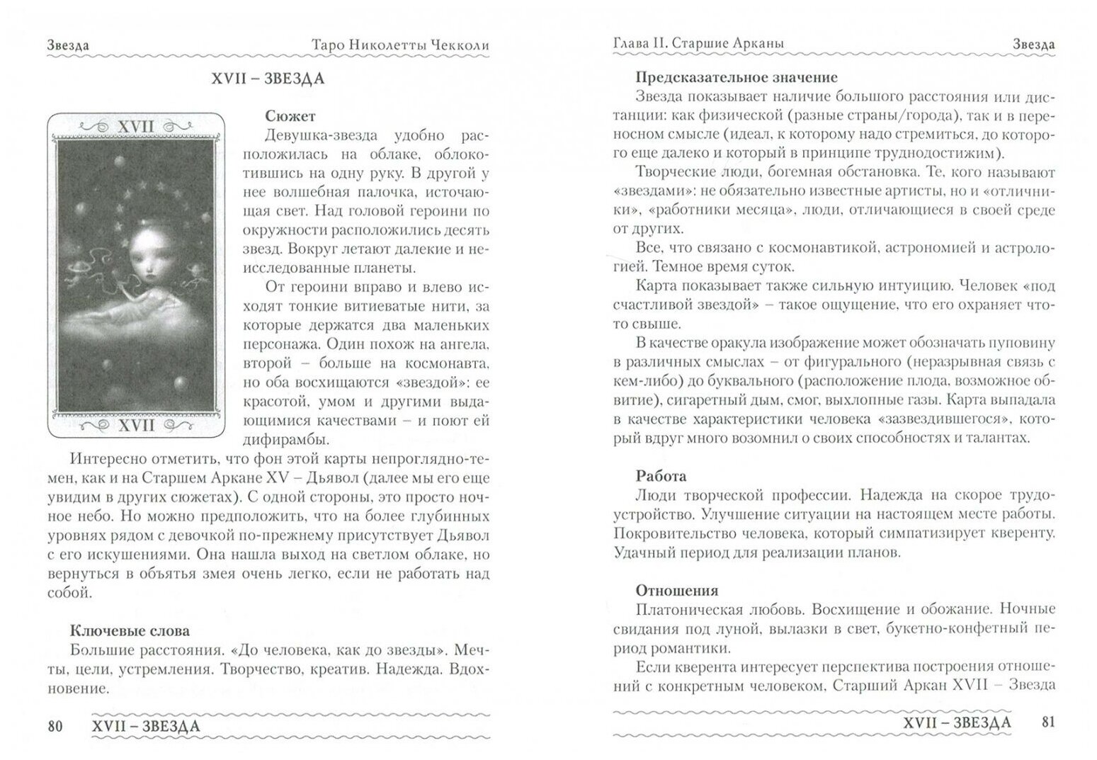 Далее, как обычно, описывается структура книги: сюжетная часть, ключевые слова (для быстрого "инсайта" в карту), предсказательное значение, работа, отношения, уязвимые точки, сновидения, позиции "да" "нет" и совет.