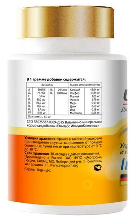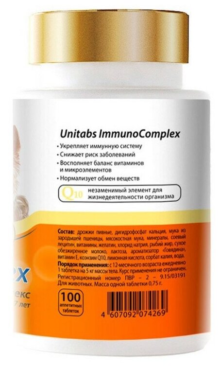 Unitabs – это серия витаминно-минеральных комплексов для собак всех возрастов и пород, которые содержат коэнзим Q10 и все необходимые витамины, макро- и микроэлементы.Формулы витаминно-минеральных комплексов Unitabs разработаны совместно с фирмой Veterinary Bio (Германия) и соответствуют европейскому стандарту качества.ImmunoComplex для мелких собак, 100 таб.Укрепляет иммунную систему. Снижает риск заболеваний. Восполняет баланс витаминов и микроэлементов. Нормализует обмен веществ.Юнитабс ИммуноКомплекс применяют собакам в возрасте от 12 месяцев до 7 лет для поддержания иммунитета и нормализации обмена веществ.Добавку вводят в корм собакам или задают перорально с руки, ежедневно из расчета 1 таблетка на 5 кг массы тела. Курс применения не ограничен.