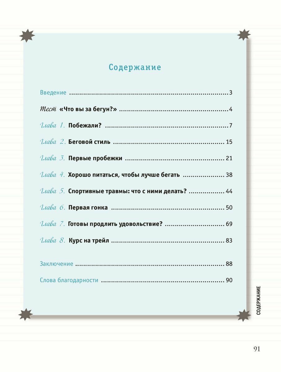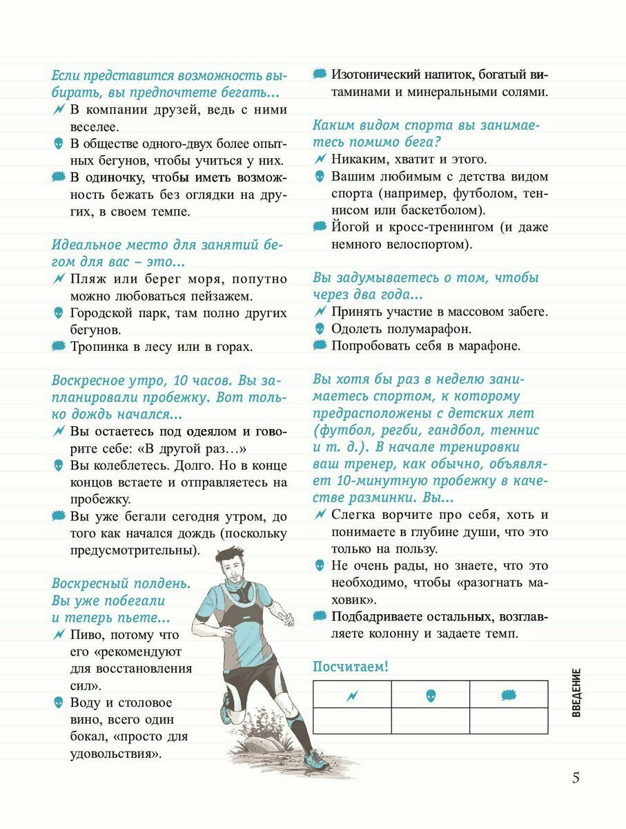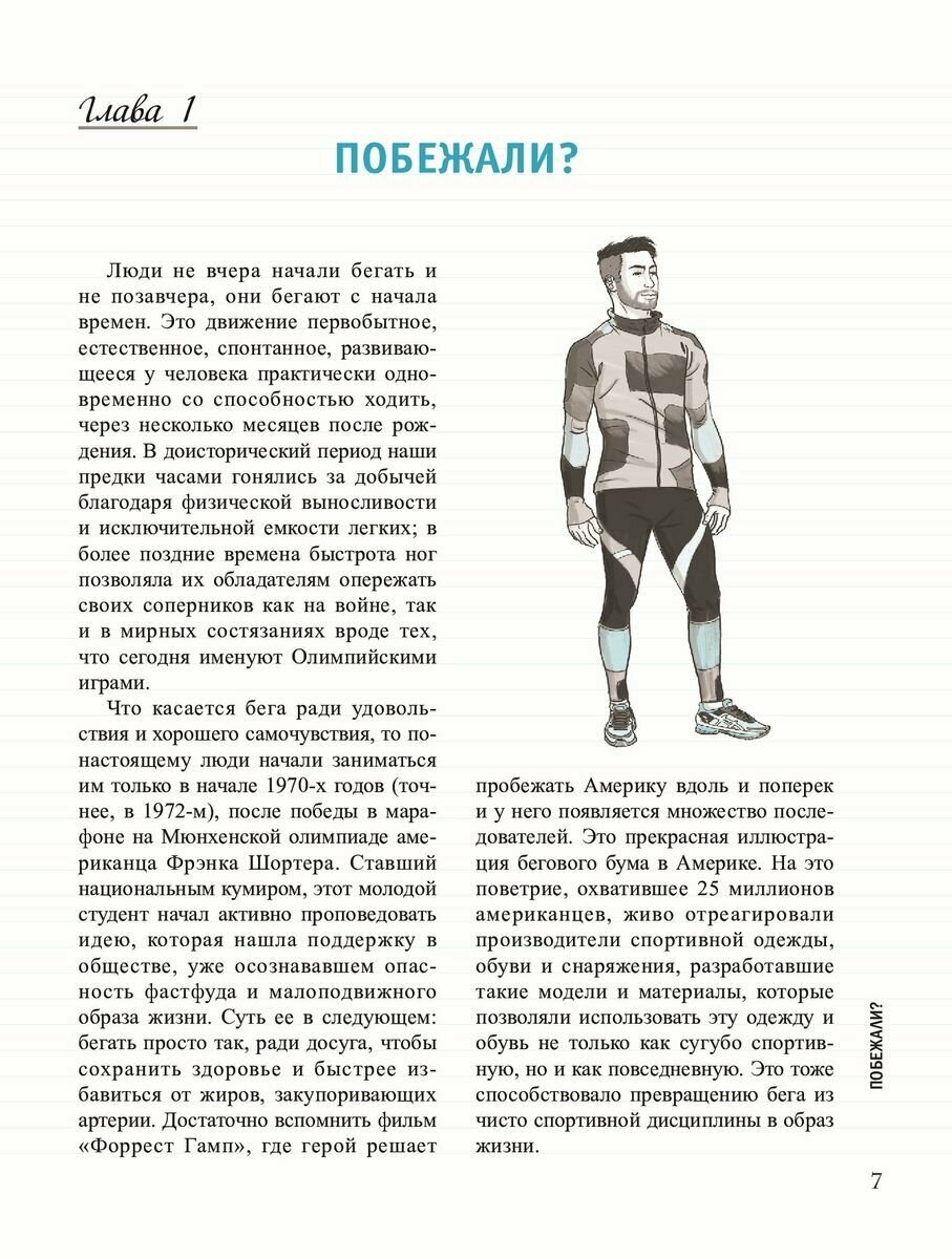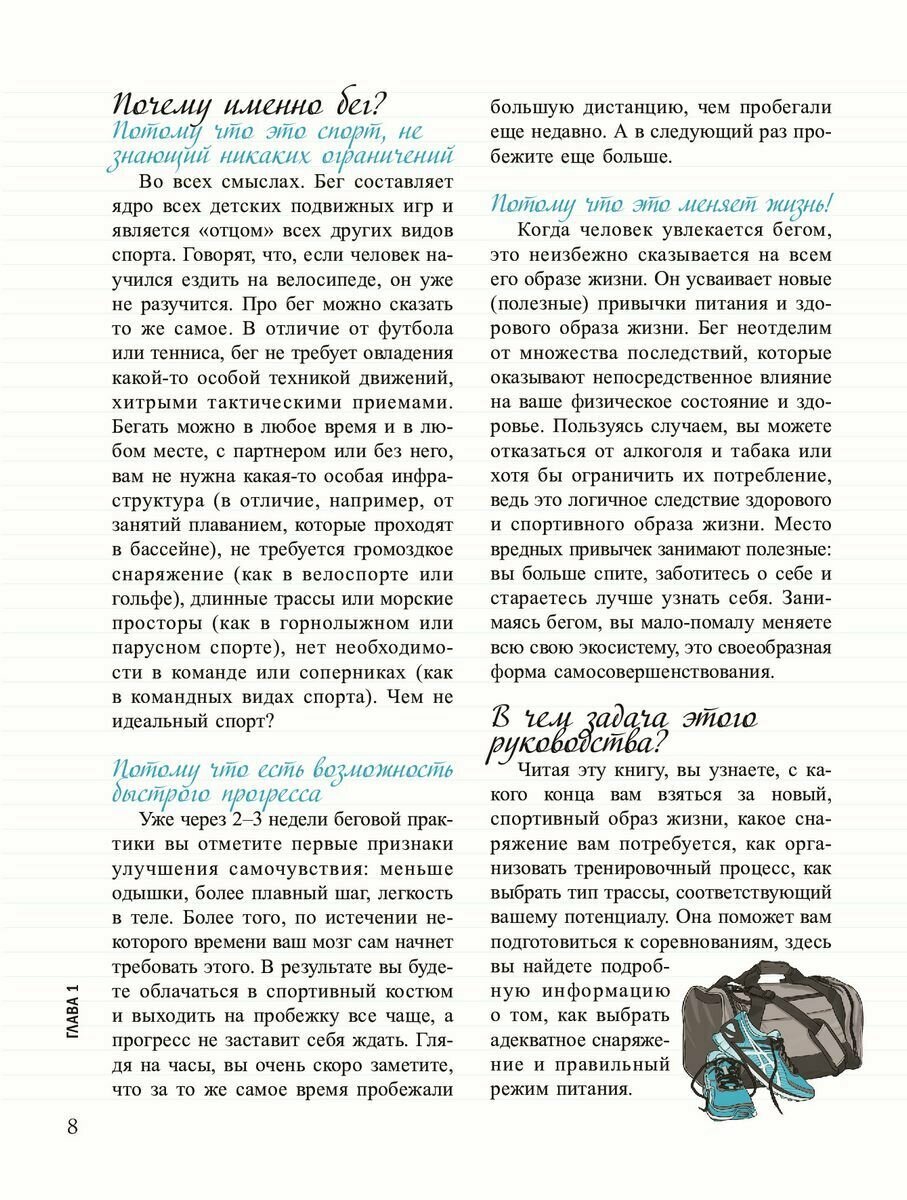 Интересная книжка. Мне понравилось: оформление (с картинками, блоки информации, выделение шрифтом), собственно формат (мягкий переплет), структура. Что есть внутри. Мини-тест нашей подготовки к бегу. Глоссарий по терминам внутри. Полезные советы, например по выбору снаряжения, даже с перечислением марок и брендов. Планы тренировок. Особенно порадовало описание первых забегов - разбор всех стадий, описание разминки с упражнениями на разные группы мышц. Постоянно уделяется внимание мотивации и травмированию (физическому). Потом идет разбор второго и третьего месяцев тренировок с усложненными упражнениями. Ещё и таблицу для ленивых расписали на этот квартал. Плюс тут же читателю предлагается возможность здесь же записать свои впечатления (да, прямо в книжке). Есть глава про питание. Есть про спортивные травмы (по мелочи в каждой главе, но есть и основная). Потом план подготовки и проведения первого забега - гонки с многими участниками (в том числе и как их начать искать). Есть даже таблица соответствия скорости и темпа для особо дотошных. Ну и небольшая глава по подготовке к полумарафону и марафону. И план тренировок к ним. есть глава и по трейлу (то бишь пересеченная местность). И финишный тест.