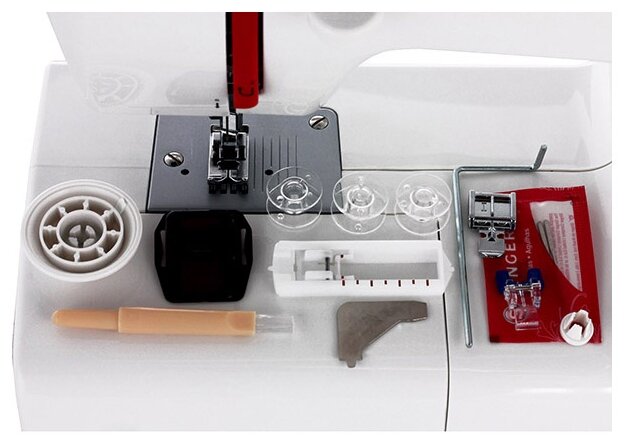 | Дополнительная комплектация | направитель, комплект игл, нож-вспарыватель, шпулька (3 шт), отвертка, катушечная пластинка, пластина для штопки и вышивки |
