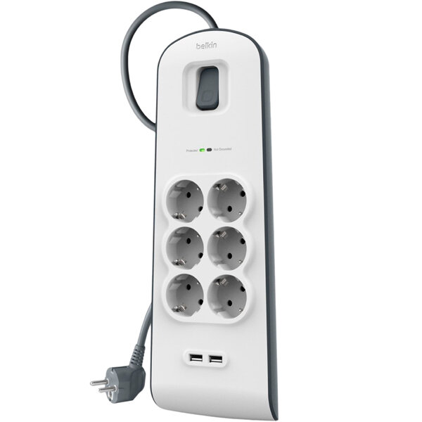 Belkin Surge Protectors (BSV604vf2M) — это сетевой фильтр на 6 розеток типа Shuko с широким набором всевозможных защит. Прибор имеет высокий уровень поглощения энергии, который составляет в своем максимальном значении 650 Дж. Также модель оснащена двумя портам USB, позволяя тем самым подзаряжать совместимые гаджеты с максимальной силой выходного тока 2.4 А. Для подключения к центральной энергосети, сетевой фильтр имеет кабель длиной 2 метра с евровилкой на конце.