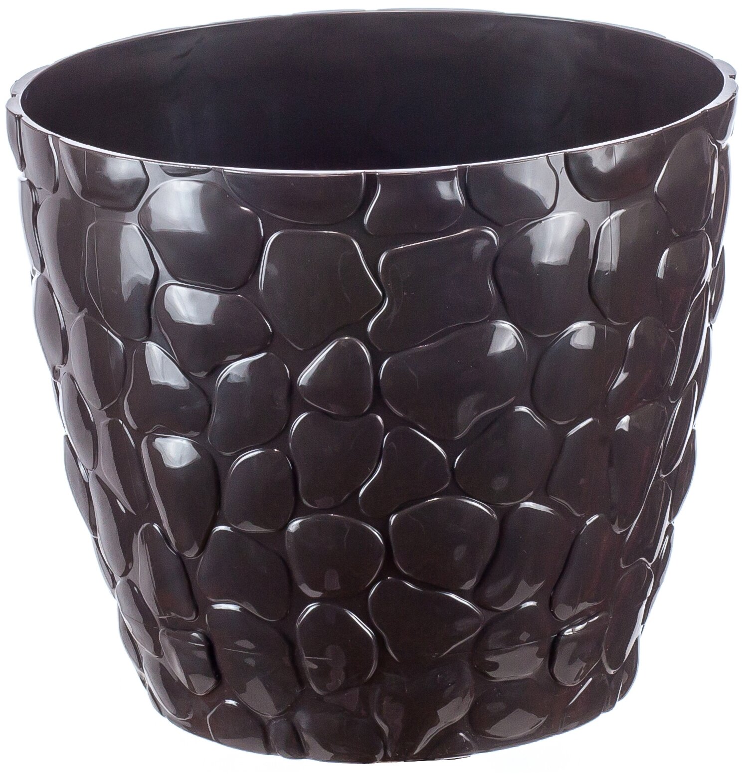 Кашпо IDEA Камни состоит из цветочного горшка с дренажными отверстиями и подставки, которая плотно крепится к основанию. Изделие из ударопрочного полипропилена имеет объемную текстуру с имитацией морской гальки.