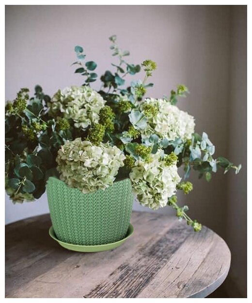 Кашпо IDEA Вязание с поддоном - стильный аксессуар для озеленения интерьера. Рельефный узор на поверхности горшка имитирует крупную вязку спицами. Кашпо привносит в интерьер нотки тепла и уюта.