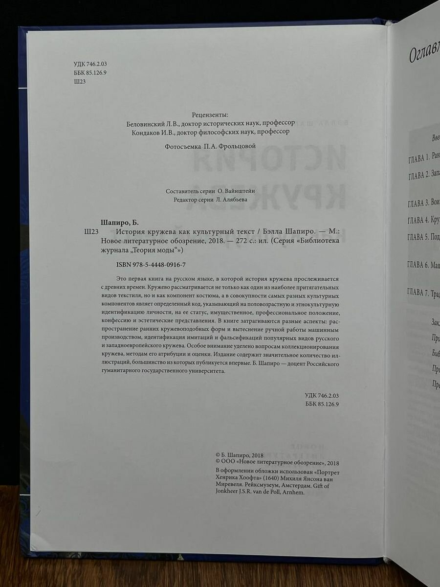 Это первая книга на русском языке, в которой история кружева прослеживается с древних времен. Кружево рассматривается не только как один из наиболее притягательных видов текстиля, но и как компонент костюма, а в совокупности самых разных культурных компонентов являет определенный код, указывающий на половозрастную и этнокультурную идентификацию личности, на ее статус, имущественное, профессиональное положение, конфессию и эстетические представления. В книге затрагиваются разные аспекты: распространение ранних кружевоподобных форм и вытеснение ручной работы машинным производством, идентификация имитаций и фальсификаций популярных видов русского и западноевропейского кружева. Особое внимание уделено вопросам коллекционирования кружева, методам его атрибуции и оценки. Издание содержит значительное количество иллюстраций, большинство из которых публикуется впервые. Б. Шапиро - доцент Российского гуманитарного государственного университета.