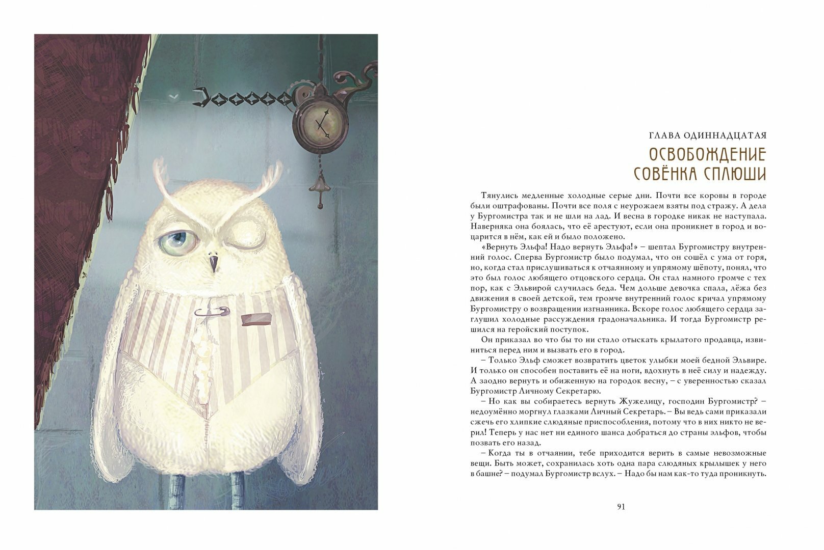 Имени у главного героя нет, просто Эльф с большой буквы. Этот чудак жил один в высокой-превысокой башне с игрушечным совенком Сплюшей и старинной лейкой Капулеттой. Интересная деталь: башня стояла на зеркальном холме (в буквальном смысле). Все, кто хотел из любопытства забраться на этот холм видели в отражении собственные страхи, пугались и падали с холма. В повествовании вообще много интересных сюжетных мелочей, а также присутствует драматизм и очень даже философский конец. Проза перемежается песенками, поют все: мясник, лейка, лодыри и зеваки поют об уснувшем времени, поет корова.