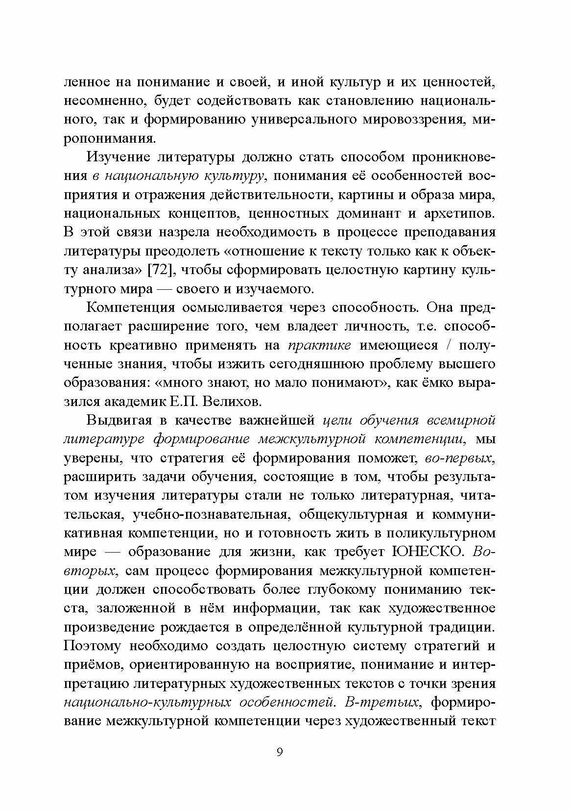 В монографии рассматривается проблема формирования межкультурной компетенции в процессе литературного образования при изучении художественного произведения. В исследовании автор освещает эволюцию понятия "межкультурная компетенция", представляет своё видение и понимание понятий "этнофилологическая компетенция", "межкультурное сознание"; раскрывает содержание межкультурной компетенции, ориентированной на художественную литературу, и предлагает концепцию педагогической модели формирования межкультурной компетенции на основе изучения художественных текстов всемирной литературы. В книге представлены разработанные критерии и уровни сформированности межкультурной компетенции у студентов-филологов, продемонстрирован опыт практической реализации процесса формирования межкультурной компетенции при обучении / изучении всемирной литературы. Предложенная методика может быть успешно использована и в процессе преподавания родной литературы.