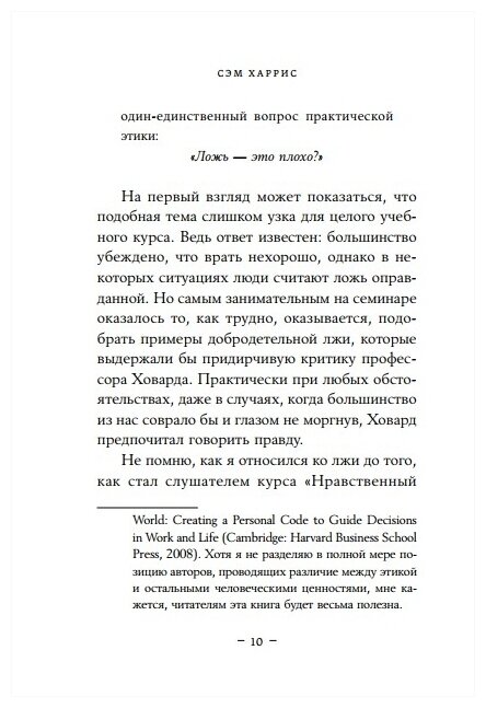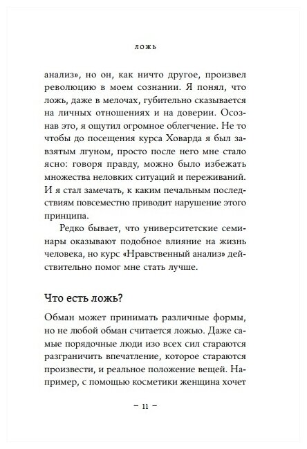 В книге рассмотрены очень, очень, и очень сложные, неоднозначные, многофакторные жизенные ситуации, в которых ложь может показаться наиболее перспективным выходом из ситуации. Сэм Харрис последовательно доводит до читателя мысль, что это вовсе не перспективный выход, а — самый простой. За эту кажущуюся простоту приходится платить и лгущему, и обманутому, даже если в краткосрочной перспективе обманутый чувствует преимущества своего положения.